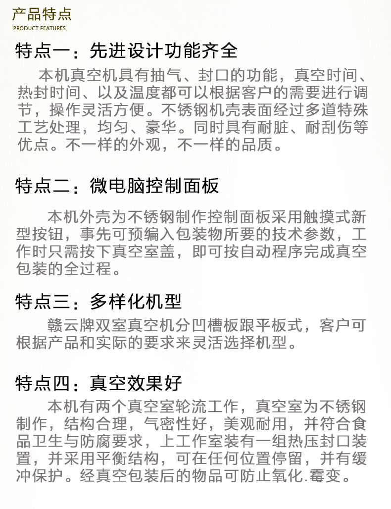 贛云牌真空包裝機是一種新穎的包裝機械,它是將包裝袋內(nèi)抽成真空后、立即自動封口,袋內(nèi)真空度高,殘留空氣少,防止了細菌等微生物的繁殖、避免了物品氧化霉變和腐敗、同時對某些松軟的物品、經(jīng)人包裝后、可縮小包裝體積、便于運輸和貯存。