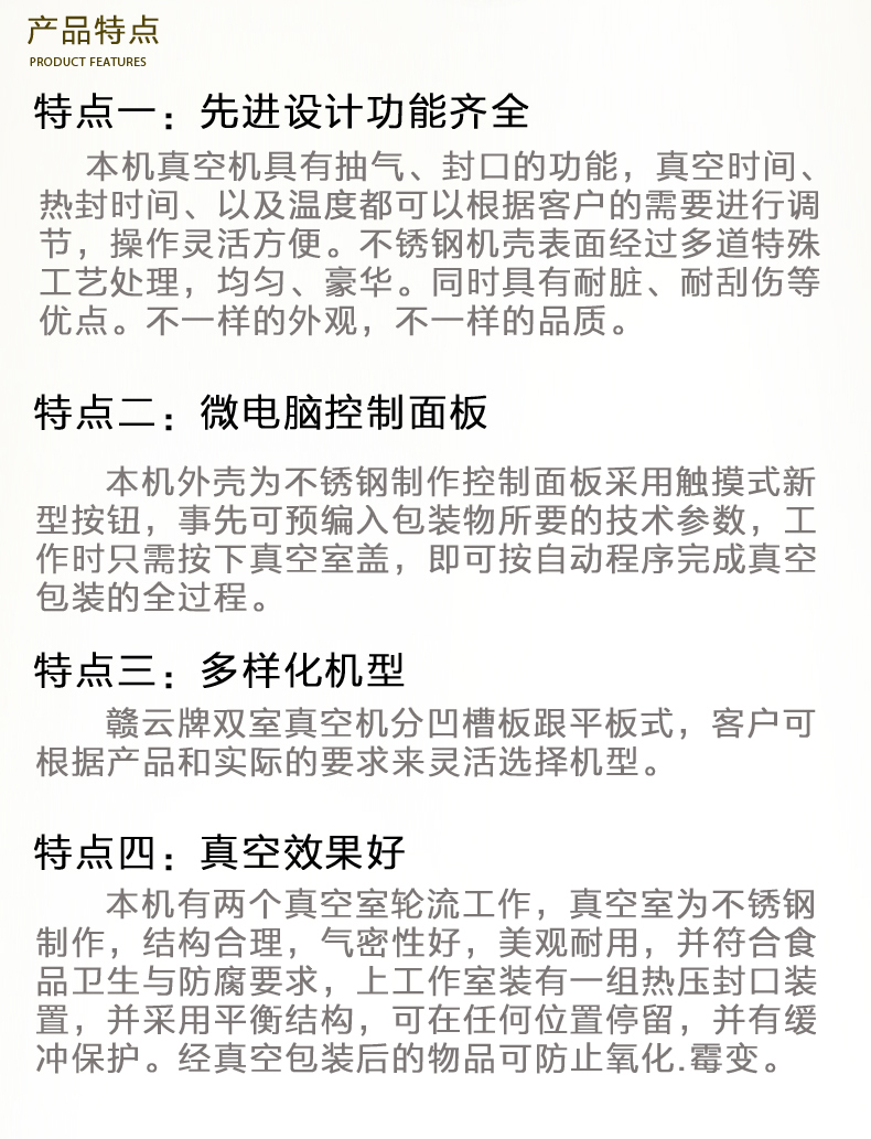 贛云牌真空包裝機(jī)是一種新穎的包裝機(jī)械,它是將包裝袋內(nèi)抽成真空后、立即自動(dòng)封口,袋內(nèi)真空度高,殘留空氣少,防止了細(xì)菌等微生物的繁殖、避免了物品氧化霉變和腐敗、同時(shí)對(duì)某些松軟的物品、經(jīng)人包裝后、可縮小包裝體積、便于運(yùn)輸和貯存。