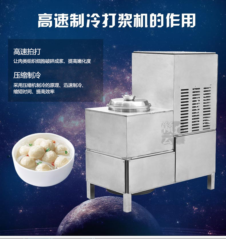 贛云專注肉丸加工設備十余載,肉丸打漿設備涉及高速、慢速、調速及三速一體,根據客戶加工需求特制高速帶制冷系統打漿機、慢速帶制冷系統打漿機、慢速變頻帶制冷系統打漿機,高速/慢速/調速三機合一肉丸打漿機,用于解決不同客戶加工需求,本設備制冷效果明顯,壓縮機功率7.5kw,制冷迅速,配合高速肉丸打漿機加工肉制品,有效保證肉質鮮嫩,品質更佳。