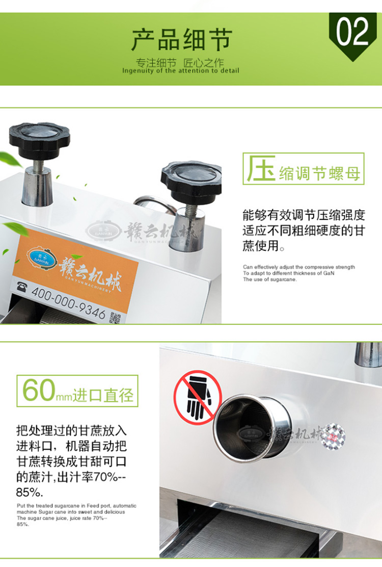 本產品適用于城鄉商場、菜場、商業街等人流量集中區。男女老少均可操作,成本低、利潤高,現榨現賣,是發家致富的好幫手。可加工甘蔗、生姜、蘋果、高粱桿、玉米桿等進行榨汁之用。