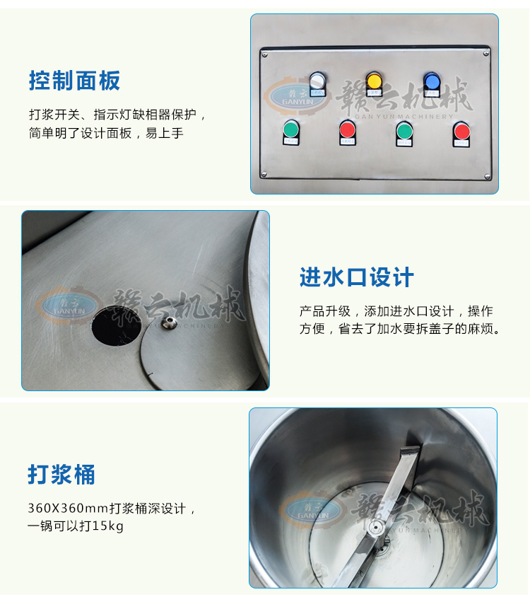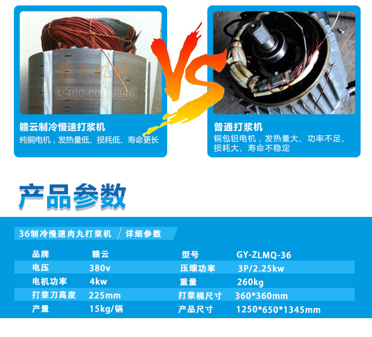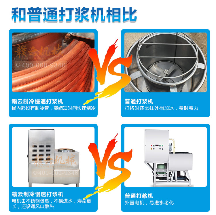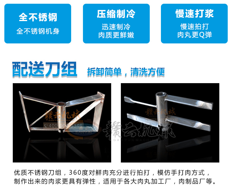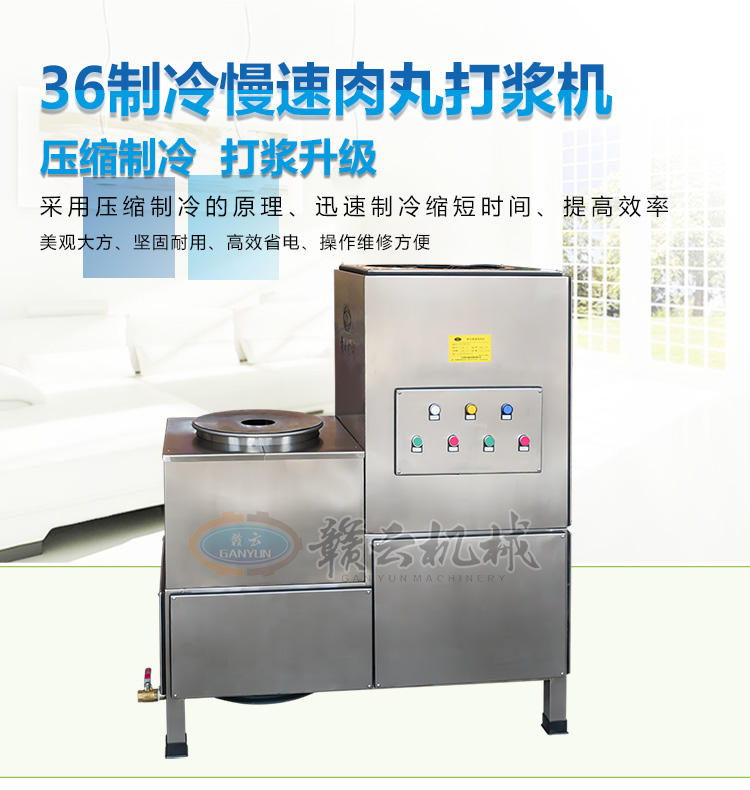 贛云牌36型壓縮機制冷式慢速肉丸打漿機,采用先進的壓縮制冷系統,對打漿外桶進行制冷,有效確保肉類制品在打漿過程肉類品質,防止升溫改變肉質,整機采用皮帶輪減速,通過慢速刀旋轉拍打肉粒魚糜等并調配成有一定粘稠度的漿狀物料,便于成型機成型,其拍打過程中能對肉類組織細胞拉絲重組,加大吸收水分,提高肉類的嫩化程度,打出來的漿類制成肉丸魚丸等,彈、脆、有嚼勁,產品一經推出,深受肉制品加工客戶青睞。