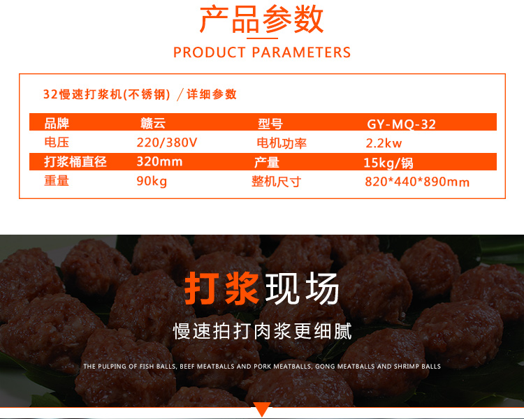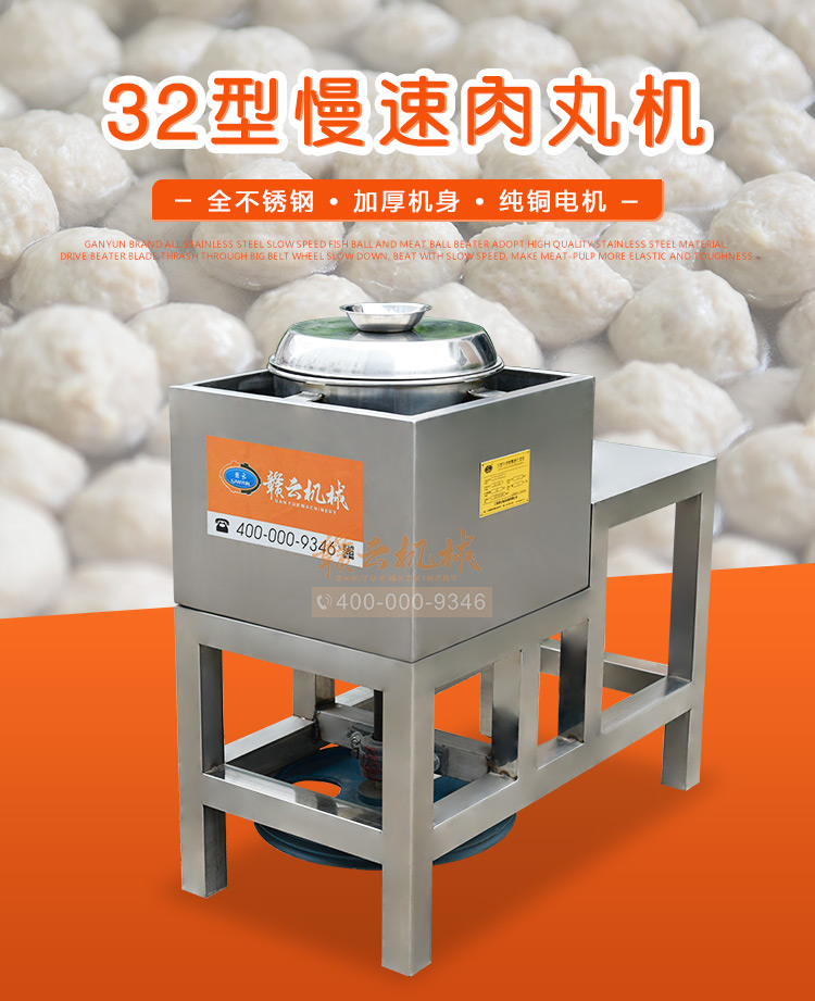 慢速肉丸打漿機有普通型和全不銹鋼型,本款為全不銹鋼系列32型慢速肉丸打漿機,打漿桶直徑320mm,一次可打肉漿15kg左右。通過大皮帶輪減速拍打肉漿,打出的肉漿更有彈性,適合魚丸、牛肉丸和貢丸的制漿之用。