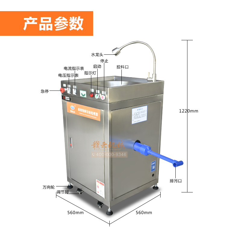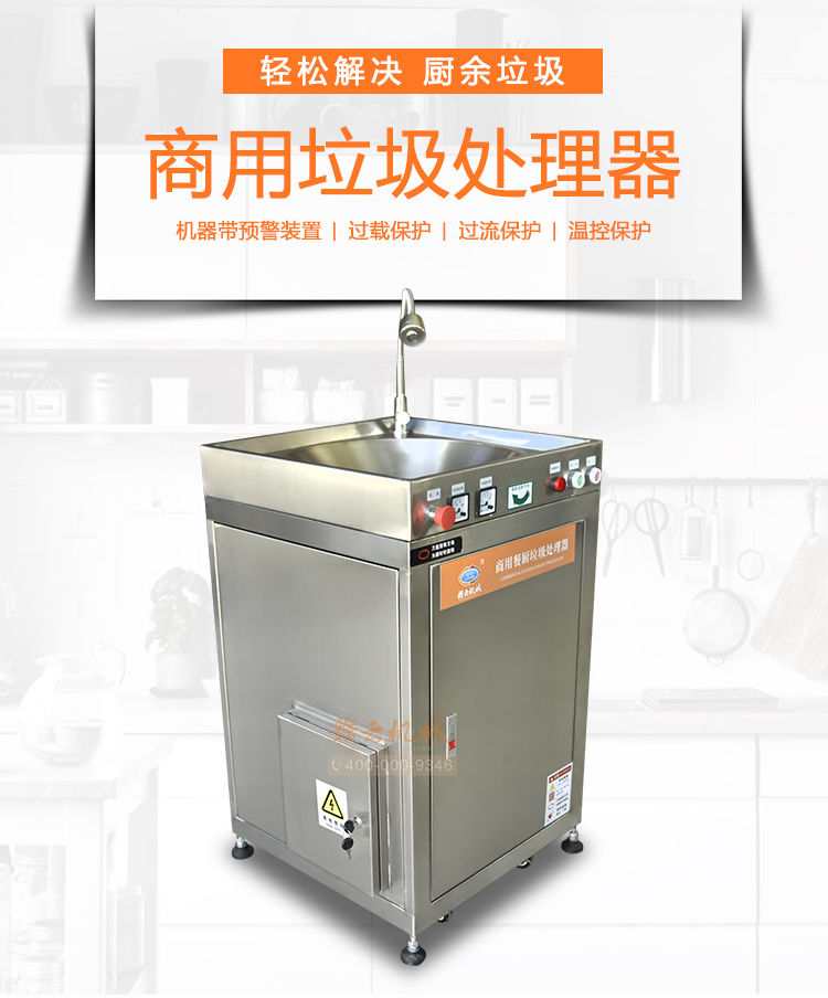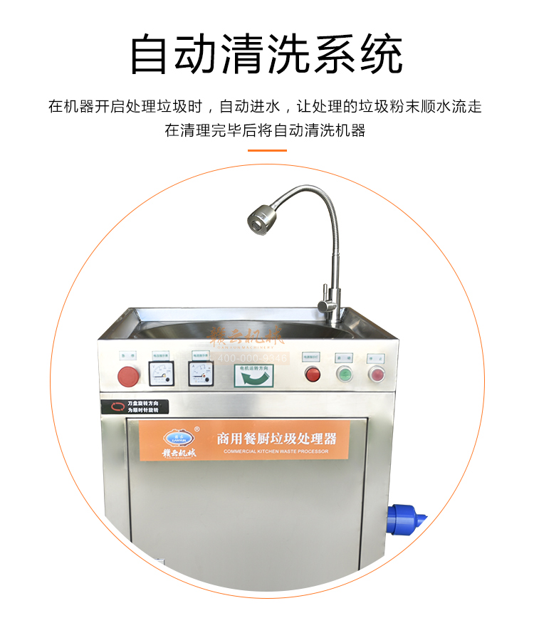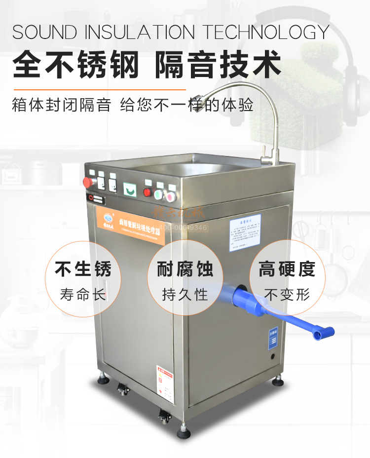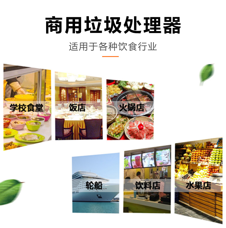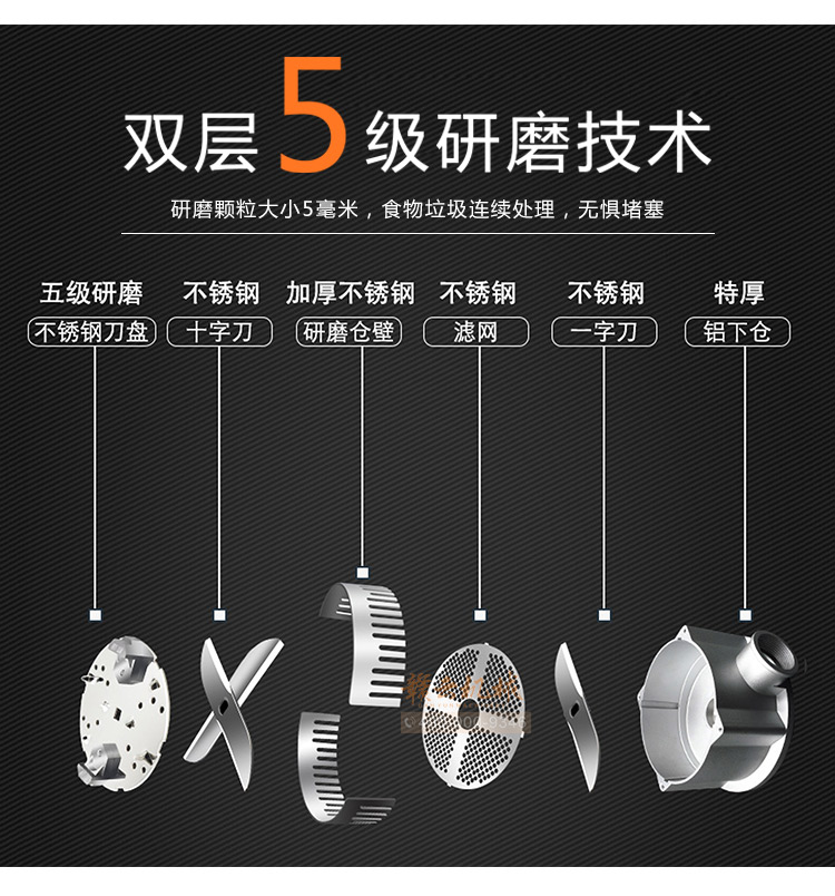 商用垃圾處理器,雙層五級研磨技術,研磨顆粒大小5毫米,食物垃圾連續處理,無懼堵塞可處理的垃圾:殘羹剩飯、肉魚骨刺、蔬菜瓜果、蛋殼、茶葉渣、玉米棒芯、牲畜骨頭、硬質貝克等食物垃圾