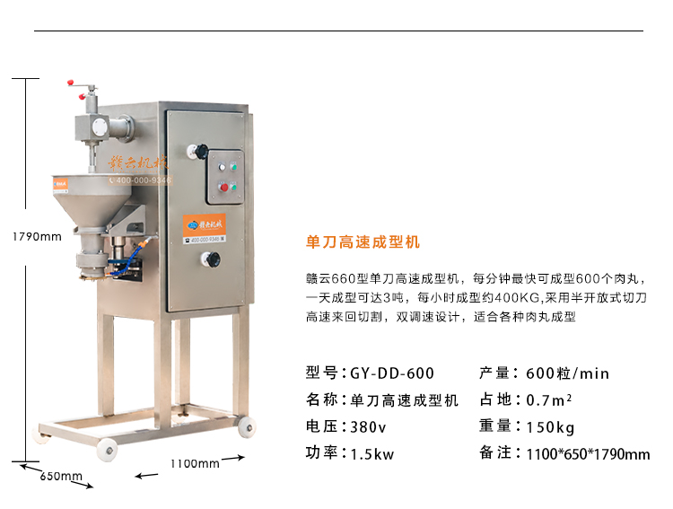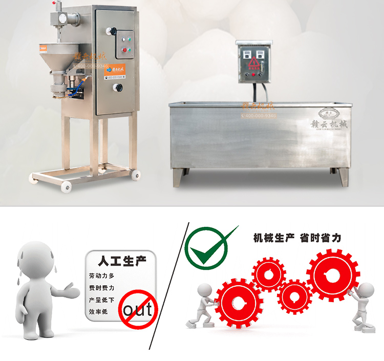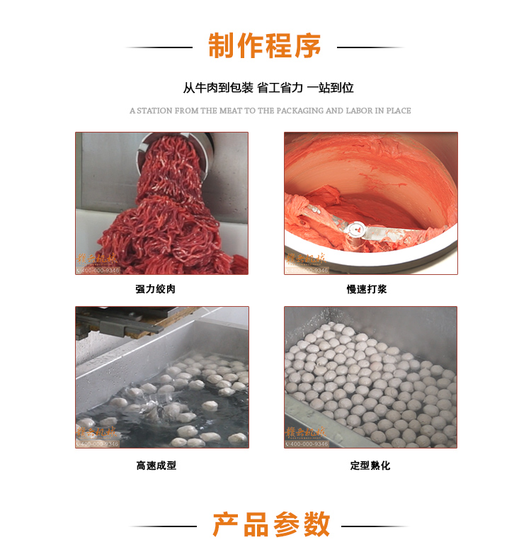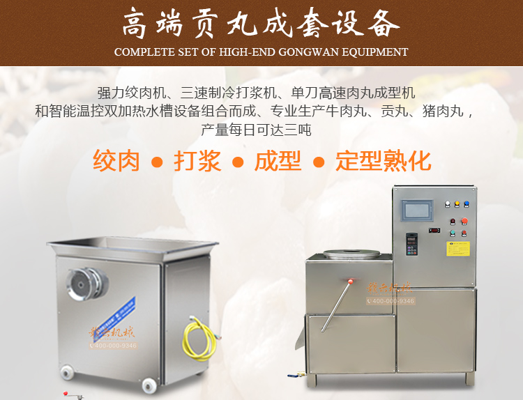 本套設備由:52型強力絞肉機、三速制冷打漿機、單刀高速肉丸成型機和1500型智能溫控雙加熱水槽設備組合而成、專業生產牛肉貢丸,豬肉丸,日產貢丸可達三噸。