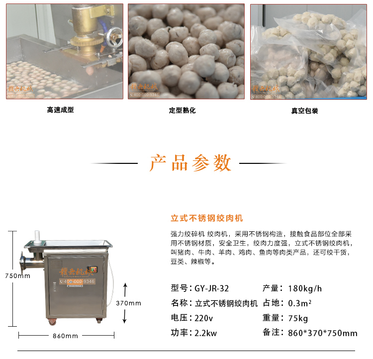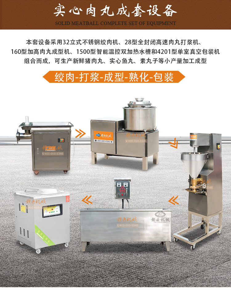 帶真空包裝新鮮豬肉丸,帶魚刺感魚丸生產成套設備,本套設備采用32立式不銹鋼絞肉機、28型全封閉高速肉丸打漿機、160型加高肉丸成型機、1500型智能溫控雙加熱水槽和4201型單室真空包裝機組合而成,可生產新鮮豬肉丸、實心魚丸、素丸子等小產量加工成型