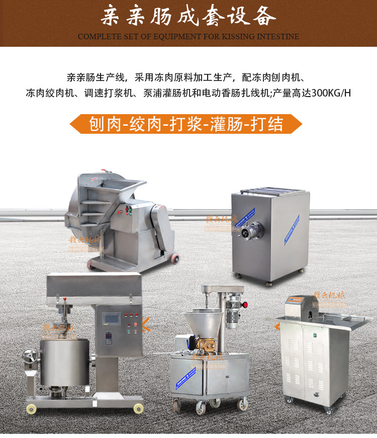 親親腸生產線,采用凍肉原料加工生產,配凍肉刨肉機、凍肉絞肉機、調速打漿機、泵浦灌腸機和電動香腸扎線機。