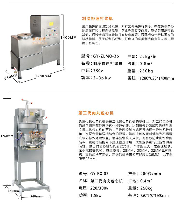 本套設備由:200型全不銹鋼魚肉采肉機、32型立式不銹鋼絞肉機、36型制冷慢速肉丸打漿機、三代肉丸包心機和智能溫控雙加熱水槽六臺設備組合而成。本套設備除了可以生產包心魚丸,還可生產實心魚丸