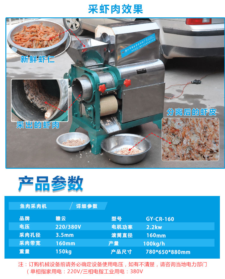 贛云牌新品普通款魚肉采肉機160型帶輪子,便于移動,魚肉魚刺分離原理:切好的魚小塊(整蝦、小蟹、小魚等)通過采肉帶輸送至采肉滾筒與采肉帶間隙,兩則相對滾動產(chǎn)生大力擠壓將魚肉擠入采肉滾筒內(nèi),魚刺和魚皮、魚鱗等因采肉滾筒壁小孔直徑只有3.5mm而無法進入,被滾筒外刮刀刮落,完成魚肉與魚骨、魚皮、魚鱗的分離。