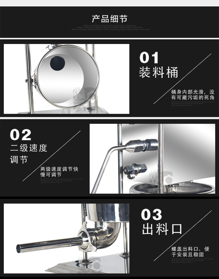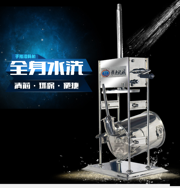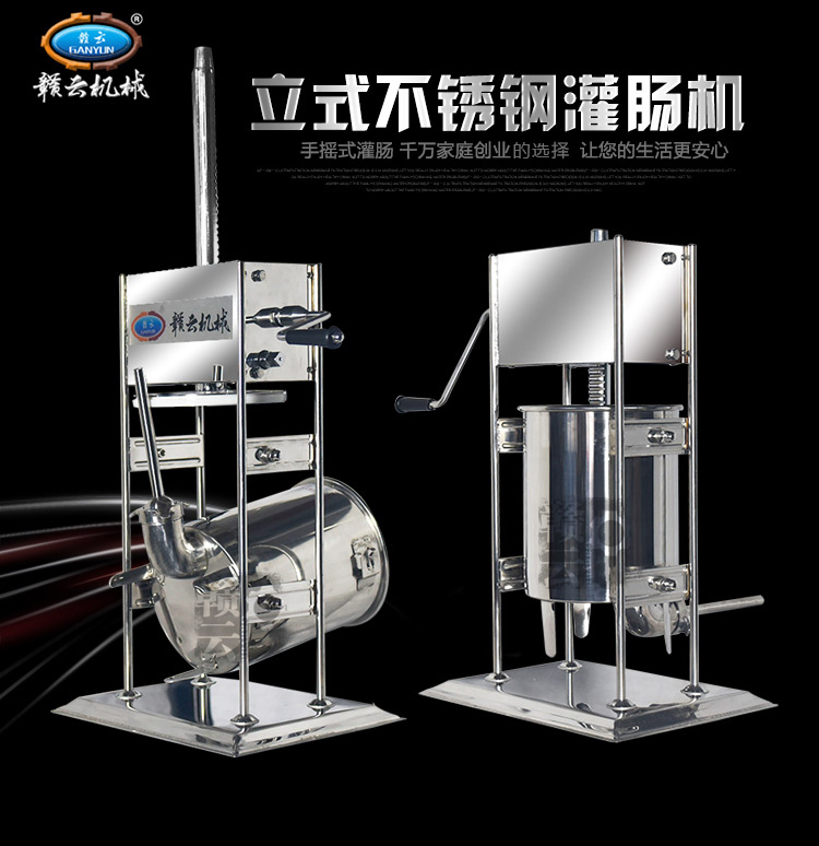 贛云牌立式不銹鋼手搖灌腸機,專業灌制各種腸類,如臘腸、香腸、火腿腸、親親腸。整機采用全齒輪優質拉桿升降系統設計,液壓式灌腸,并兩檔速度可調,并有效利用了機械杠桿省力原理,讓你灌腸輕松自在,灌腸完畢之后還可放心全身水洗,裝料桶亦可方便拆卸,便于清洗。