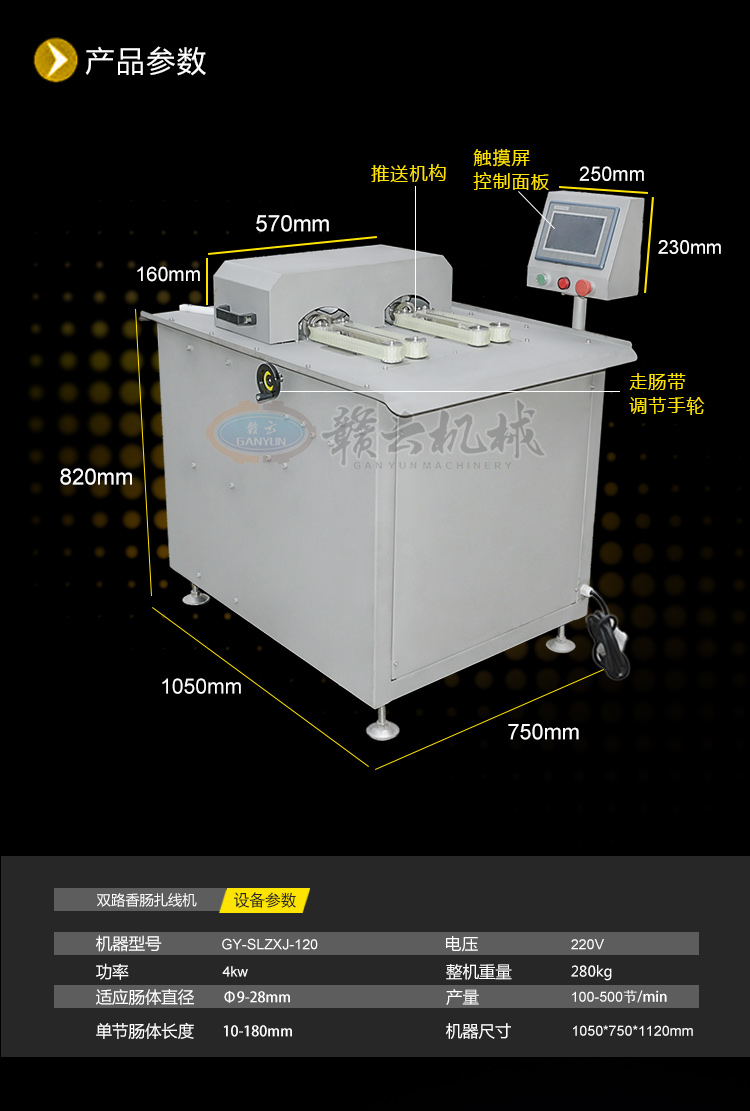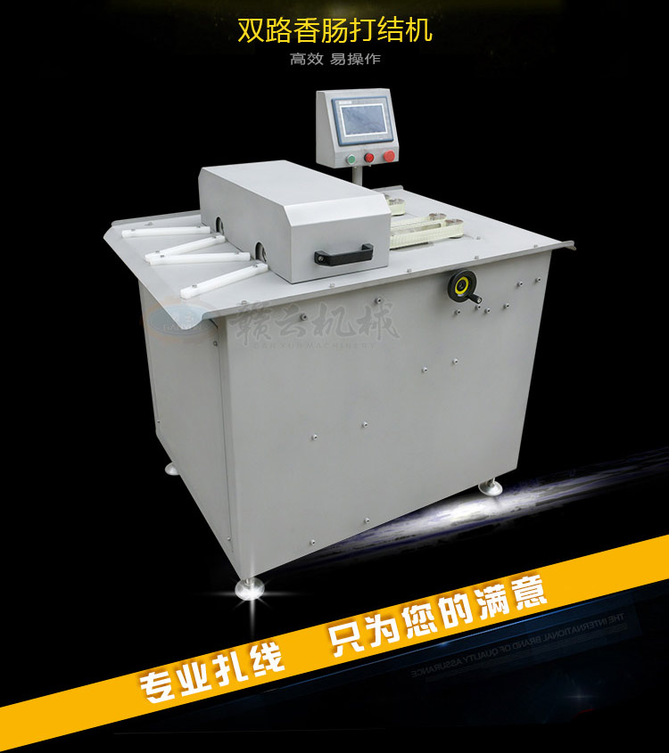 全自動動雙路高速香腸扎線機(jī),自動分份,自動繞線,全程自動化控制。該機(jī)采用了優(yōu)質(zhì)電機(jī)和本公司自主研發(fā)的控制系統(tǒng),機(jī)身全不銹鋼制造、效率高、易操控、節(jié)約生產(chǎn)原料等優(yōu)點(diǎn),產(chǎn)品長度的調(diào)節(jié)可以隨心所欲