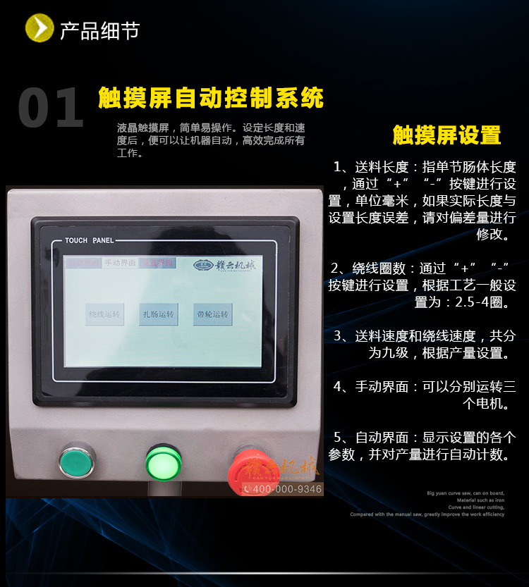 該香腸扎線機(jī)機(jī)械的優(yōu)點(diǎn)是節(jié)約腸衣,并且線扎的產(chǎn)品不用人工和機(jī)械剪節(jié),相對扭結(jié)可節(jié)約人工3人以上和對剪節(jié)設(shè)備的投入;相對半自動扎線機(jī)可節(jié)約10人的費(fèi)用,切免除工人的體力勞動之苦。該扎線機(jī)操控十分簡單,由于采用人機(jī)對話的液晶屏,設(shè)定長度和速度后,便可以讓機(jī)械自動高效完成所有工作。