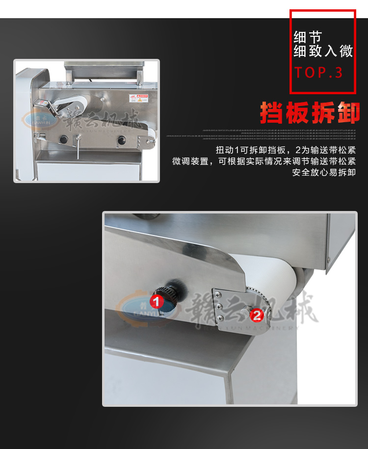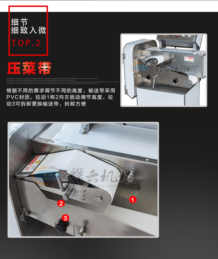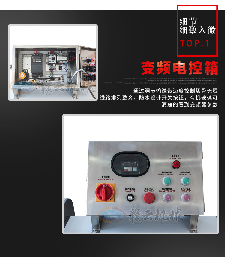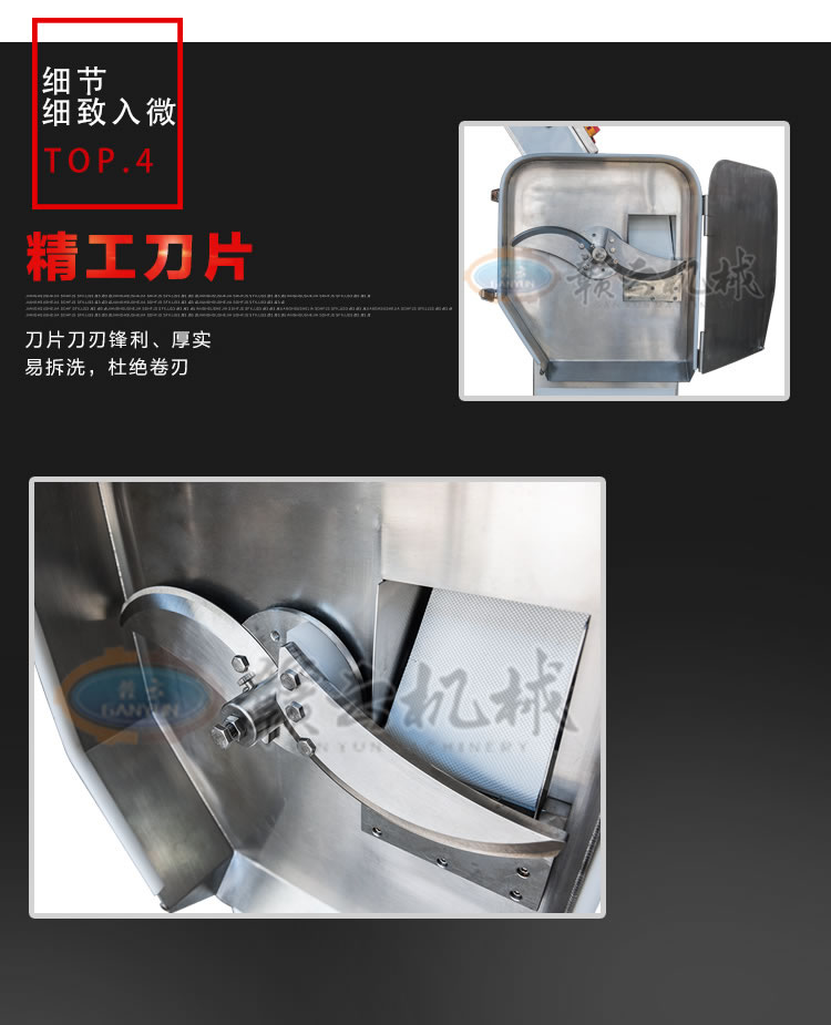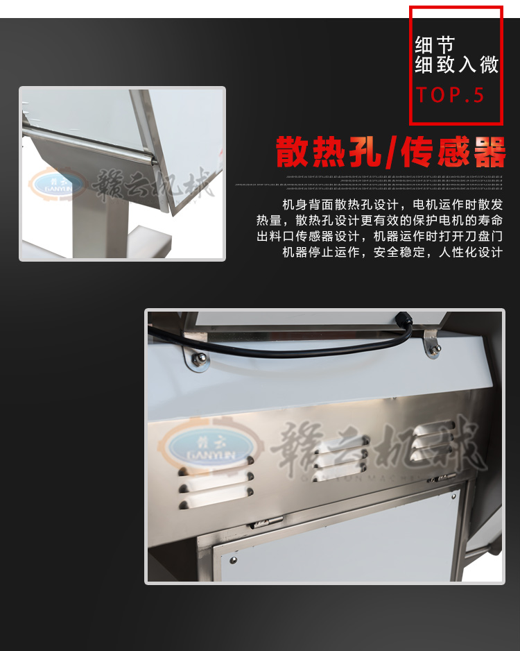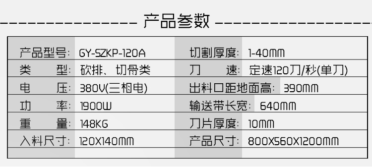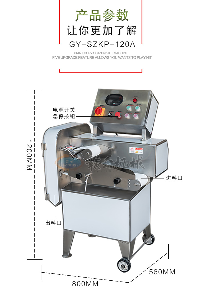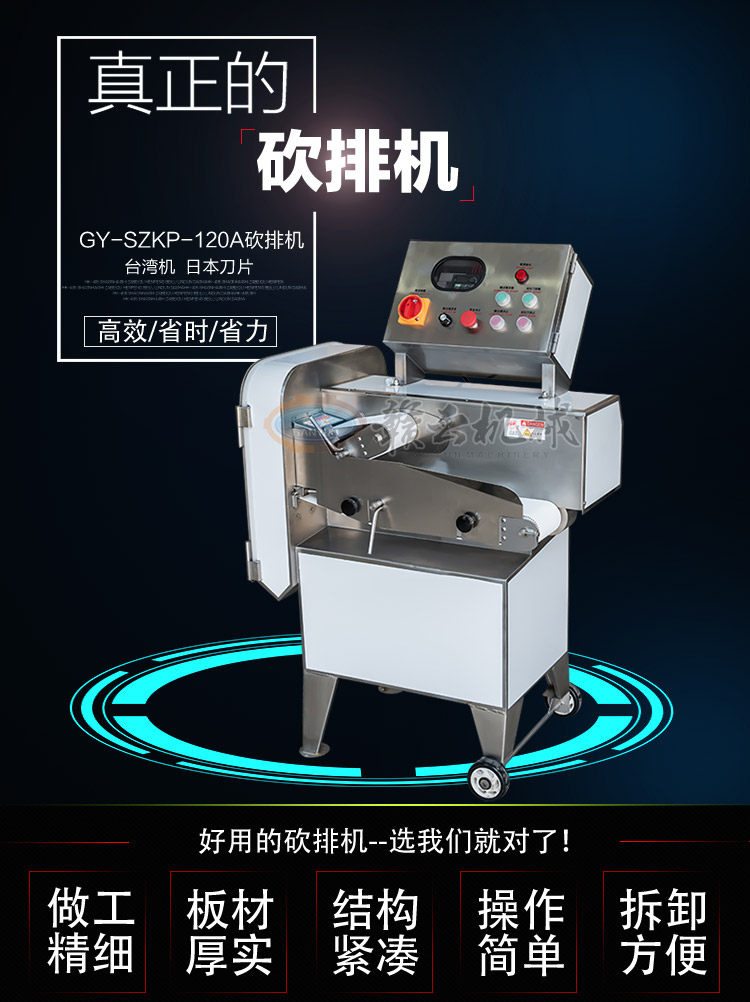 GY-SZKP-120A砍排機(jī),優(yōu)質(zhì)刀片。通過(guò)調(diào)節(jié)輸送帶速度控制切骨長(zhǎng)短線(xiàn)路排列整齊,防水設(shè)計(jì)開(kāi)關(guān)按鈕,有機(jī)玻璃可清楚的看到變頻器參數(shù)。壓菜帶根據(jù)不同的需求調(diào)節(jié)不同的高度,輸送帶采用PVC材質(zhì),可拆卸更換輸送帶,拆卸方便。優(yōu)質(zhì)刀片,杜絕卷刃。機(jī)身背面散熱孔設(shè)計(jì),電機(jī)運(yùn)作時(shí)散發(fā)熱量,散熱孔設(shè)計(jì)更有效的保護(hù)電機(jī)的壽命,出料口傳感器設(shè)計(jì),機(jī)器運(yùn)作時(shí)打開(kāi)刀盤(pán)門(mén)機(jī)器停止運(yùn)作,安全穩(wěn)定,人性化設(shè)計(jì)。