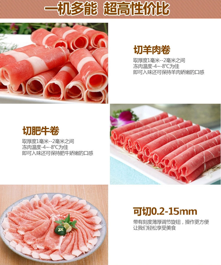 贛云牌全自動羊肉切片機采用加硬不銹鋼刀片,有效的保證了切割效率,切片厚薄可調0-15mm,可切零度以下凍肉,是凍羊肉、牛肉、豬肉切片,切卷利器;該機采用雙電機分別控制切肉刀轉動和推料走動,切肉刀轉動控制開關關閉狀態會自動切斷推料走動電機電源,已確保操作人員的人身安全。整機設計科學合理、美觀大方、省時省力、安全高效,是火鍋店、酒店、西餐等加工羊肉卷信賴的設備。