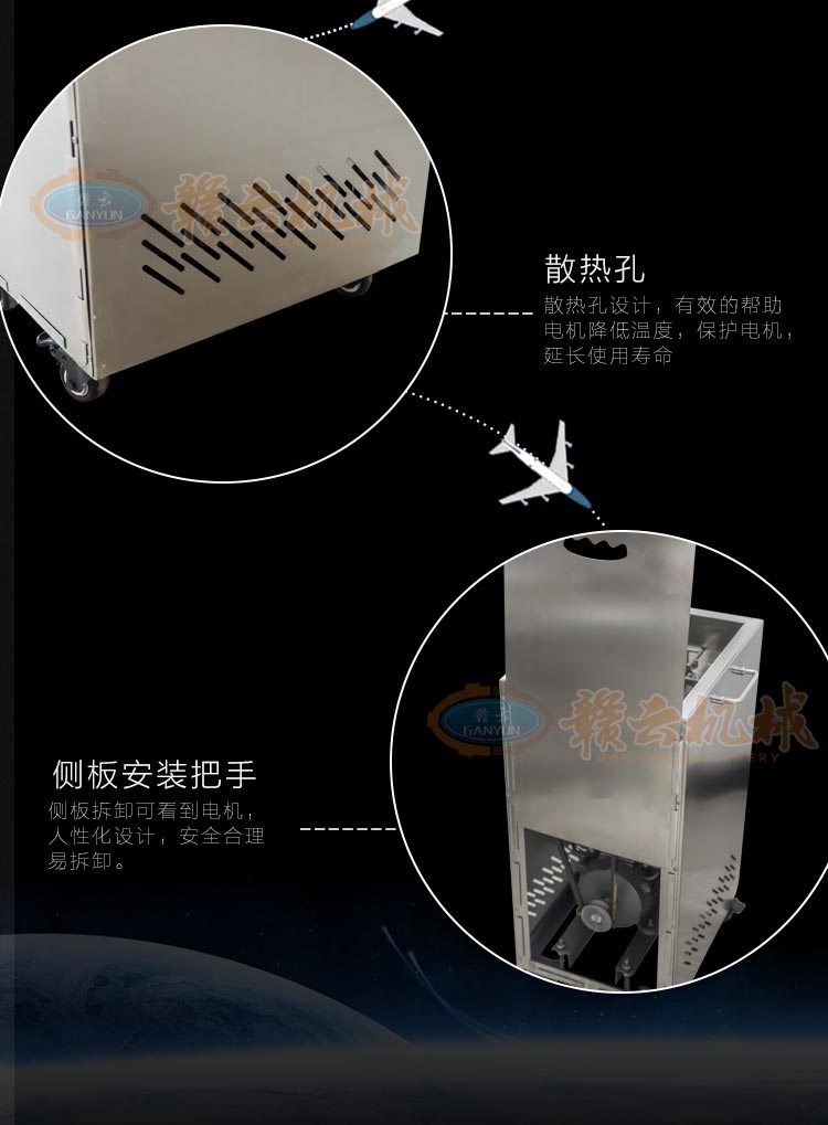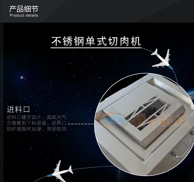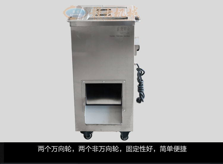 不銹鋼切肉機不銹鋼切肉機,進料口鏤空設計,方便看到下料進度,進料口防護蓋板材加厚,堅固耐用。鋒利刀片,刀間距3.5mm,切切肉片、肉絲、肉粒。防水旋鈕開關。折疊出料口,節省空間,推回可防止料斗刮壞。側板拆卸可看到電機。304不銹鋼機身,兩個萬向輪,兩個非萬向輪,容易固定,省心。