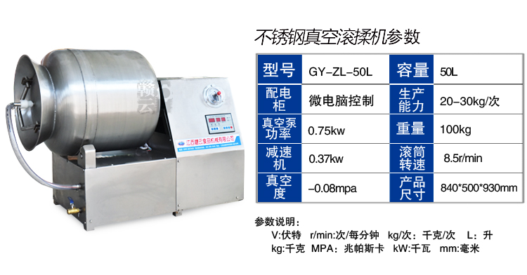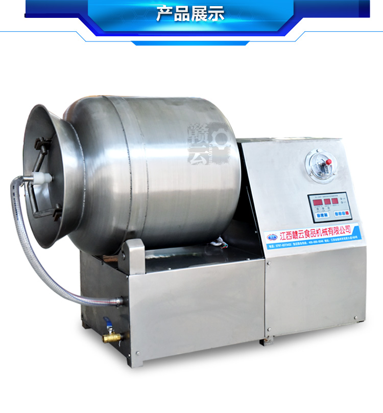 滾揉機除了能加速腌效果外,采用滾揉技術達到肉質嫩化效果的也是西式火腿加工的重要工序,然肉質在常規的滾揉機械加工過程中常常會因為摩擦滾揉升溫而容易導致肉質變質,因此滾揉的時間需要控制的十分好。贛云真空滾揉機是為了彌補常規型滾揉機的缺點而進行科學的設計,真空狀態下可以很好的保證肉質的質量,在經過微電腦控制滾揉時間,使得整個滾揉工藝變得簡單化和可快速復制性。