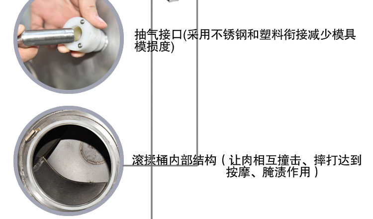 滾揉機可以使肉均勻的吸收腌漬,可以提高肉的結著力及產品的彈性;可以提高產品的口感及斷面效果;可以增強保水性,增加出品率;可以改善產品的內部結構,節能高效。整機采用不銹鋼制造,結構緊湊,滾筒兩端均采用旋壓式封帽結構,最大的增加滾筒內的摔打空間,使滾揉產品的效果均勻,噪音小,性能可靠,操作簡便,使用效率更高。
