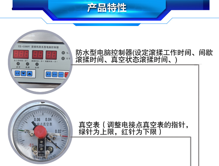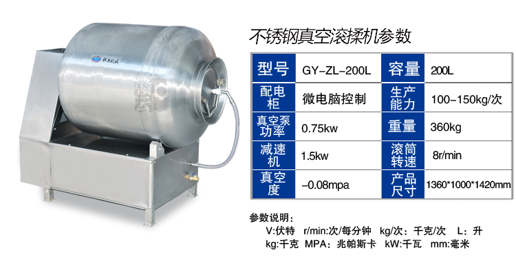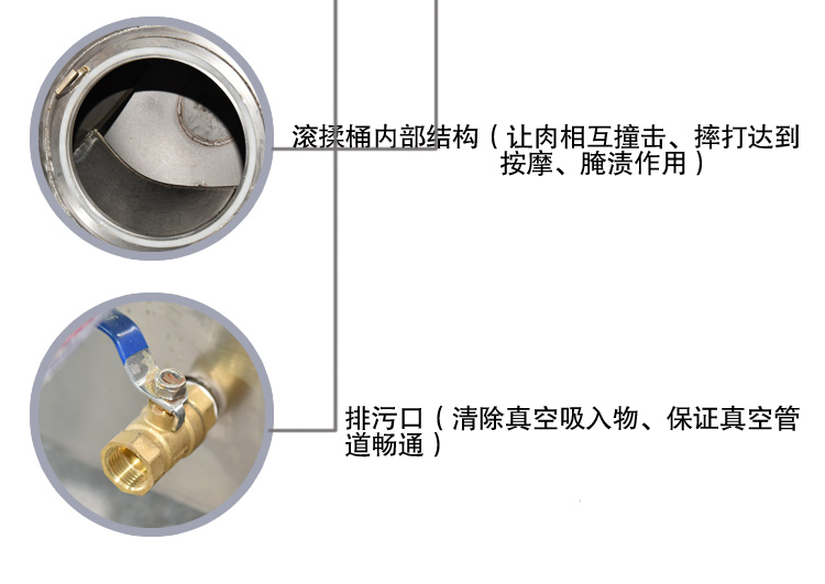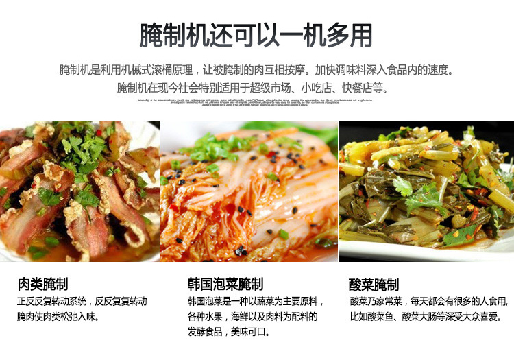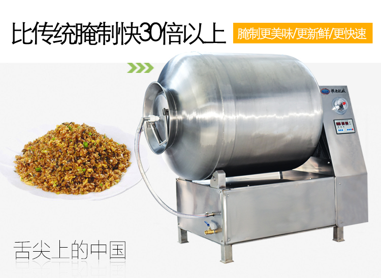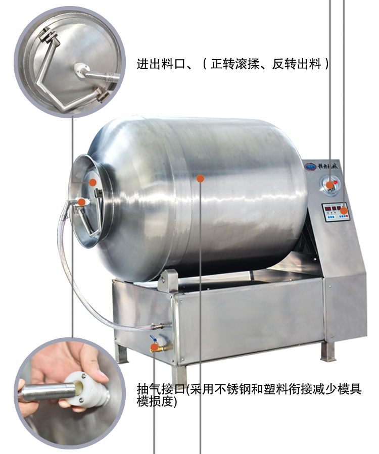 真空滾揉機(jī)可以使肉均勻的吸收腌漬,可以提高肉的結(jié)著力及產(chǎn)品的彈性;可以提高產(chǎn)品的口感及斷面效果;可以增強(qiáng)保水性,增加出品率;可以改善產(chǎn)品的內(nèi)部結(jié)構(gòu),節(jié)能高效。整機(jī)采用不銹鋼制造,結(jié)構(gòu)緊湊,滾筒兩端均采用旋壓式封帽結(jié)構(gòu),大大的增加滾筒內(nèi)的摔打空間,使?jié)L揉產(chǎn)品的效果均勻,噪音小,性能可靠,操作簡(jiǎn)便,使用效率更高。