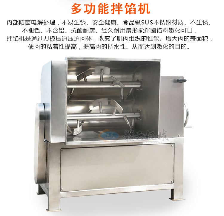 本機采用304不銹鋼材質設計,符合食品衛生加工需求,絞龍型攪拌鋼軸可向內向外雙向攪拌旋轉運動,由倒順開關控制攪拌方向,適合粘稠度較大物料的攪拌,攪拌過程還對肉質起嫩化效果,是肉餡、肉醬、菜餡等攪拌的上好設備。
