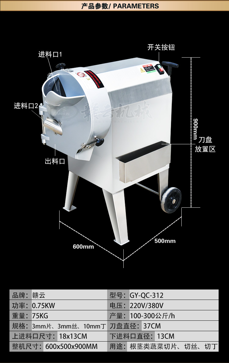 贛云312型多功能切菜器看起來體積不是特別大,整臺機器設計理念就是以輕巧輕便為方向,讓機器本身在廚房中不會占有用多大的空間,雖然看起來個頭不大,但機器生產量可不小,可達到每小時300公斤的產量,而且易于清洗,在通過以往的長時間數據顯示,機器本身也有著很長使用壽命和低故障,在機器使用過程中只要我們按照正確的使用方法,就不會容易出現故障等問題,即使機器長時間不使用也可以將機器清洗干凈晾干后放置在干燥通風的地方保存好以免受潮損壞。