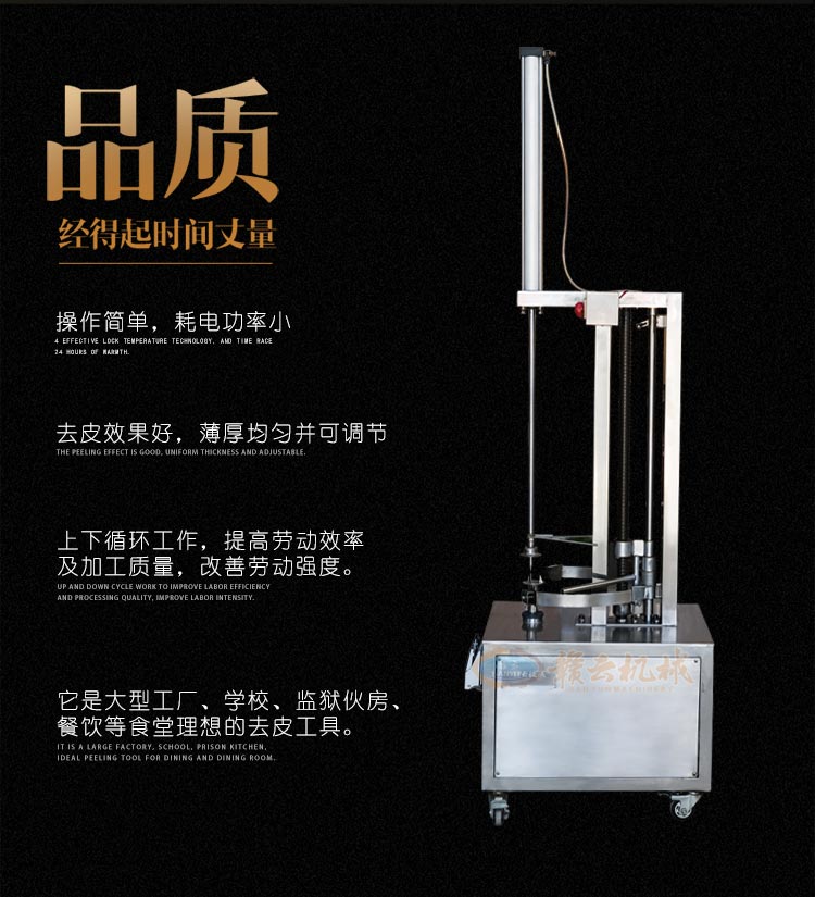 電動不銹鋼大型瓜果去皮機適用于木瓜,南瓜,冬瓜,哈密瓜,柚子等大中型瓜類削皮,削皮厚薄可調。刀組上下循環削切效率高,去皮率高達95%以上。削皮刀架特殊設計,可使瓜皮定向排出,方便收集清理。機器拆洗方便,使用時操作簡單,清洗方便,安全衛生。去皮機適用于餐飲行業,飯堂,食品加工廠,冷凍食品廠,休閑食品廠,西餐店設備,飲品店設備,茶餐廳等。防水開關,可調厚度,鋼質刀片耐用不生銹。它是大型工廠、學校、伙房等食堂理想的去皮工具。