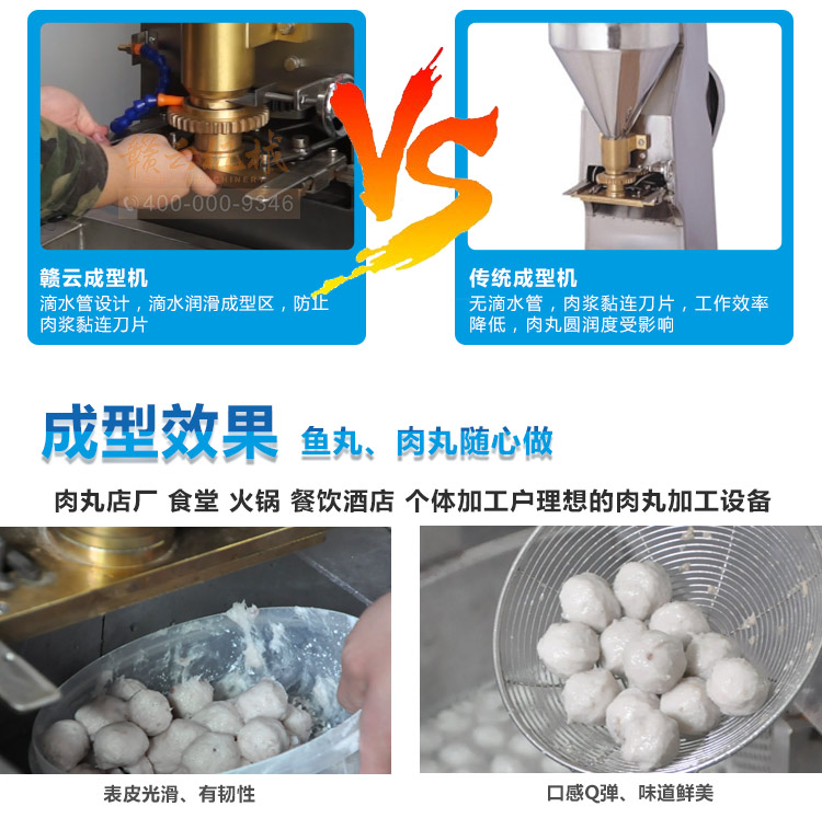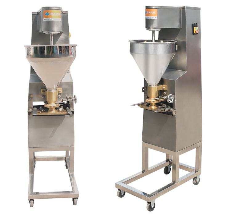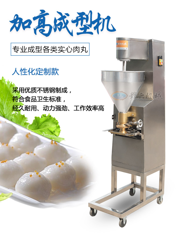 本款實心肉丸成型機是在120型實心肉丸成型機的基礎上加高設計,是配合我司設計的雙加熱水槽而設計,隨機配15、20、25MM三套成型模具,可做三種規格丸子,采用絞龍推料擠壓,切刀快速切割成型原理設計,每分鐘可成型約260個肉圓,圓度可調,是實心肉丸、魚丸、蝦丸、蟹丸、雞肉丸、素丸子等加工成型利器。