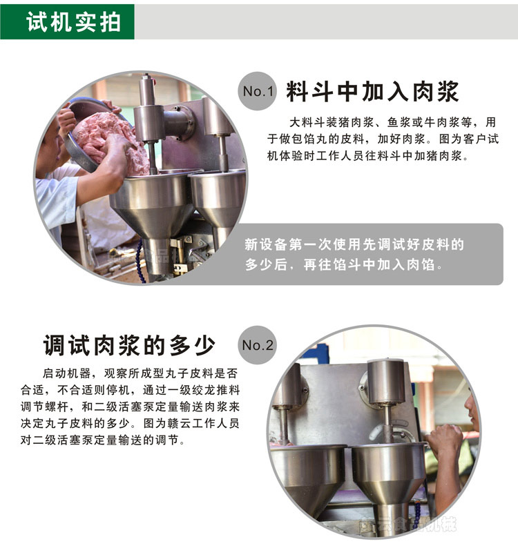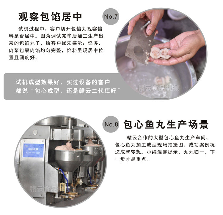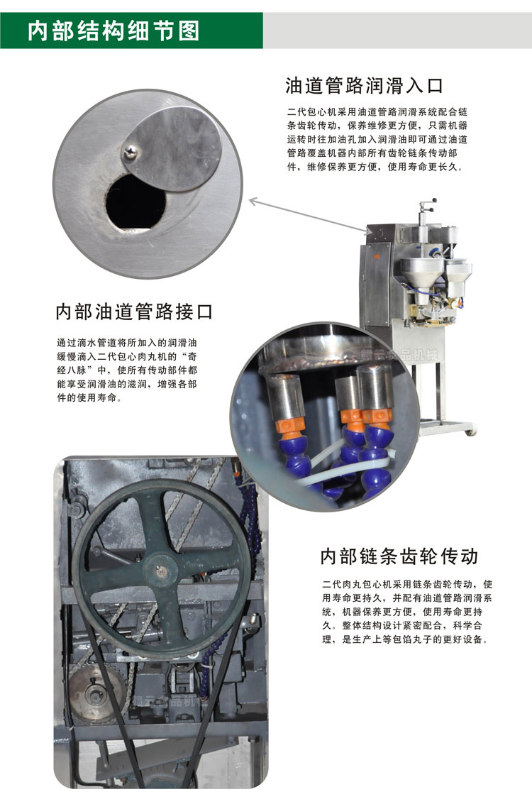 第二代包心機在第一代包心機的基礎上做了很大改進,1、材質方面,一代包芯機采用430不銹鋼材質,二代包芯機使用304不銹鋼板材,外觀上更顯檔次;2、潤滑系統,一代包芯機采用皮帶和齒輪傳動,無潤滑系統,一般壽命3-5年,而二代肉丸包芯機采用鏈條和齒輪傳動,并配有油道管路潤滑系統,使用壽命是肉丸包芯機的兩倍之多