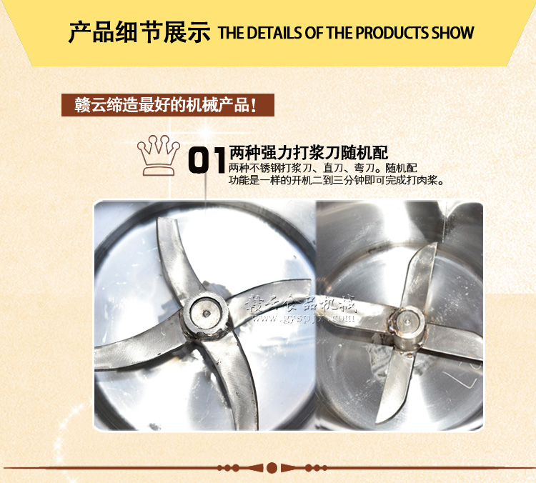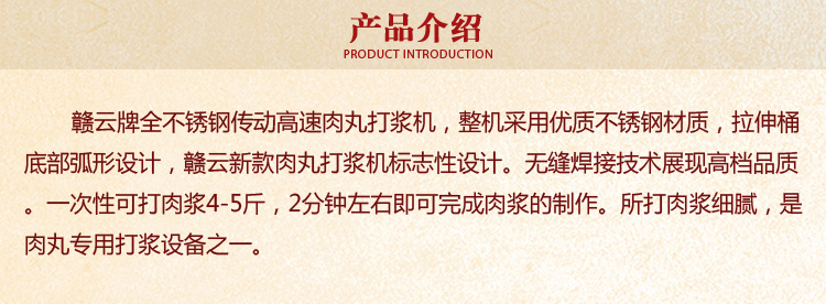 贛云牌全不銹鋼傳動高速肉丸打漿機,整機采用優(yōu)質(zhì)不銹鋼材質(zhì),拉伸桶底部弧形設計,贛云新款肉丸打漿機標志性設計。無縫焊接技術(shù)展現(xiàn)高檔品質(zhì)。一次性可打肉漿4-5斤,2分鐘左右即可完成肉漿的制作。所打肉漿細膩,是肉丸專用打漿設備之一。