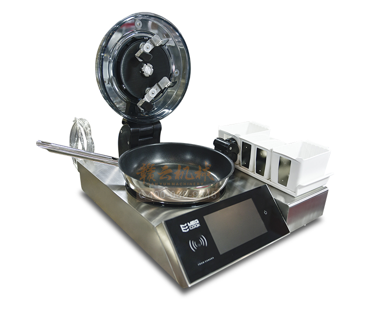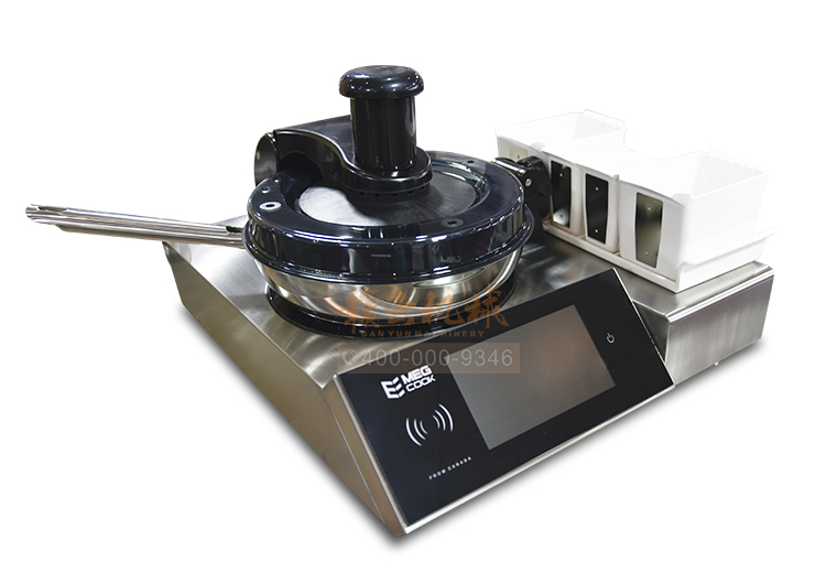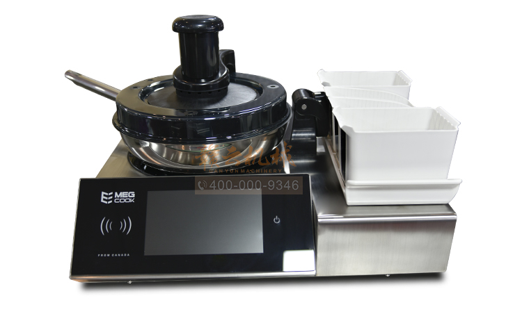 全自動智能烹飪機器人,無需人員輔助,自動加油、加水、加料;機器自己炒菜, 便攜ic卡,菜單只需一張ic卡即可讀入,分時入料,完全根據中國菜譜要求,在適當的時間加入對應的材料;智能溫控,不糊鍋,不產生油煙,更健康。