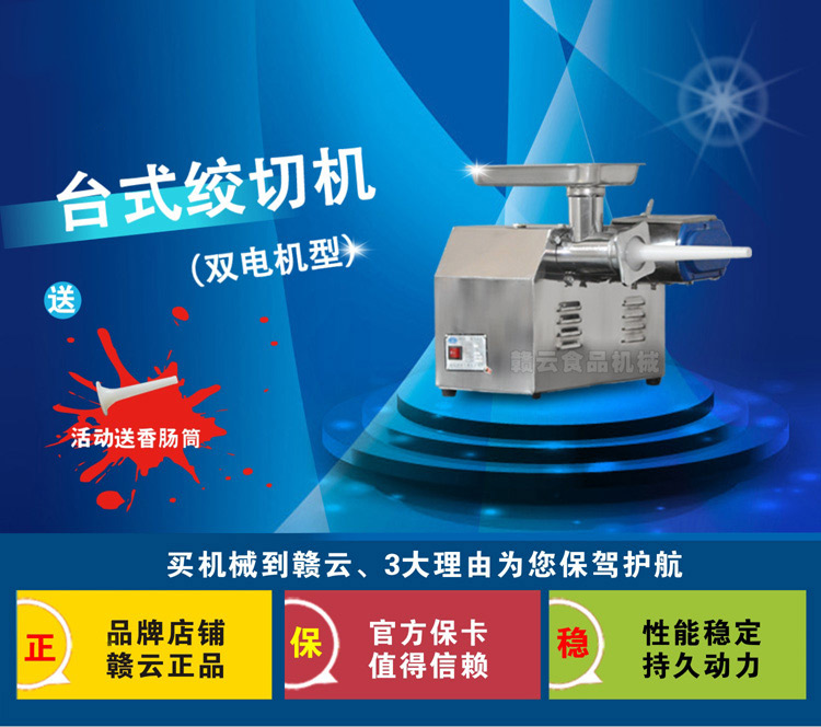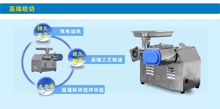 臺式絞切機雙電機是贛云推出12型臺式絞切機之后的又一款新品之作,采用不銹鋼板材將兩臺機器封裝在一個機身之中,絞肉機頭和切肉機頭因不屬于同一電動機控制,可分開工作,亦可同時工作,采用不同開關控制,操作更方便。
