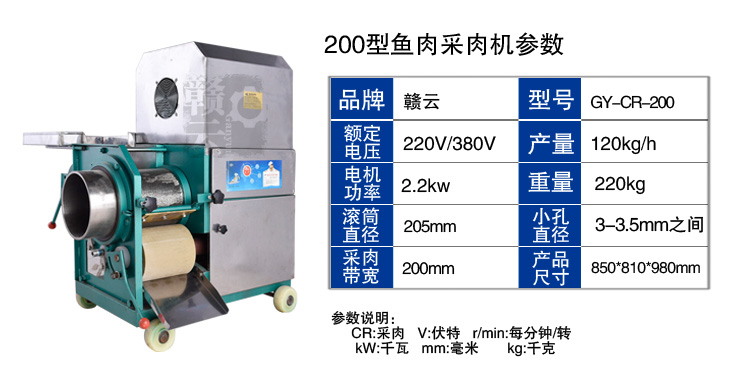 贛云牌魚肉分離機又稱之為魚肉采肉機、魚糜采取機、蝦殼分離機、去魚骨機、泥鰍采肉機、去魚刺機,通過擠壓原理將魚肉和魚骨等分離開來,魚肉采肉前需漿活魚去頭部和內臟。贛云牌魚肉分離機有普通材質和不銹鋼材質之分。