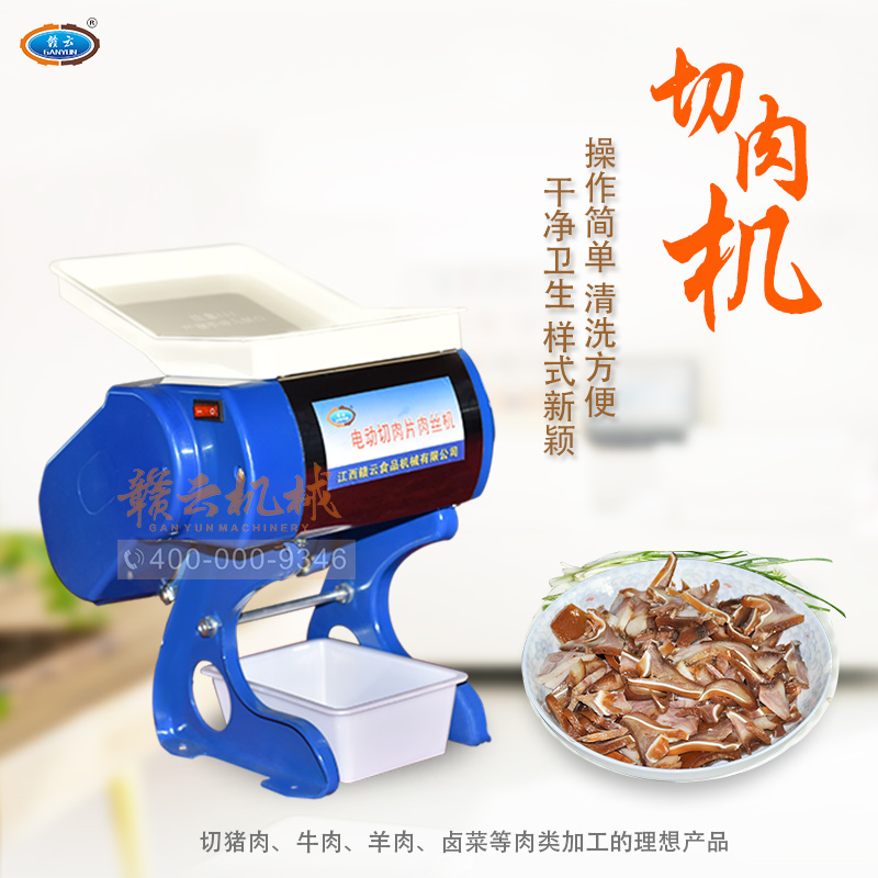 小型臺式電動切肉機主要是切豬肉、牛肉、羊肉、鹵菜等肉類加工的理想產品,廣泛應用于鹵菜加工商販、食堂、飯店等場所。切肉機頭內切肉刀片一共有36片圓形刀片,均等分布,切肉刀片間距為3.5mm,也有刀片間距為2.5mm的切肉機,歡迎選購