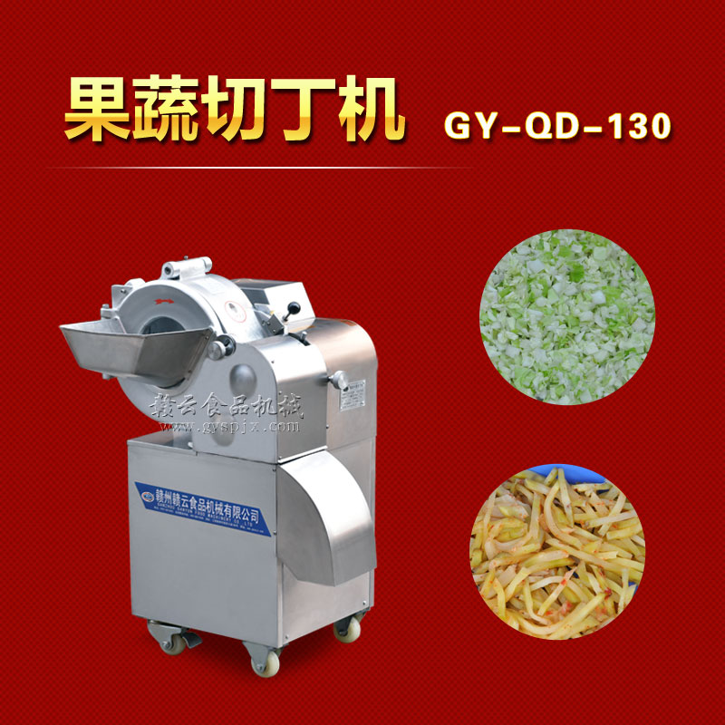 工作原理:GY-DQ-130型切丁機通過旋轉撥盤將被切物體帶動高速旋轉,利用物體的離心力,立刀將物體切成片狀,然后經(jīng)過圓盤切絲刀片豎切成條狀,并將條狀物送入橫切斷刀口,由橫切斷刀盤切刀切成所需的長方體或立方體。