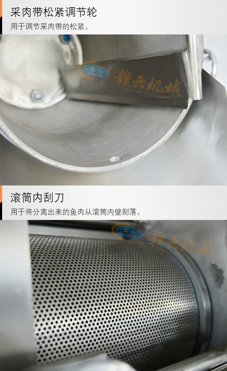 贛云牌350型魚肉采肉機采用全304不銹鋼,整體結構設計高端大氣,牢固耐用,性能穩定,各種調節裝置設計合理,人性化操作程度高,增加了潤滑軸承的功能。以下是這款機器的結構示意圖和實物拍攝細節圖等。