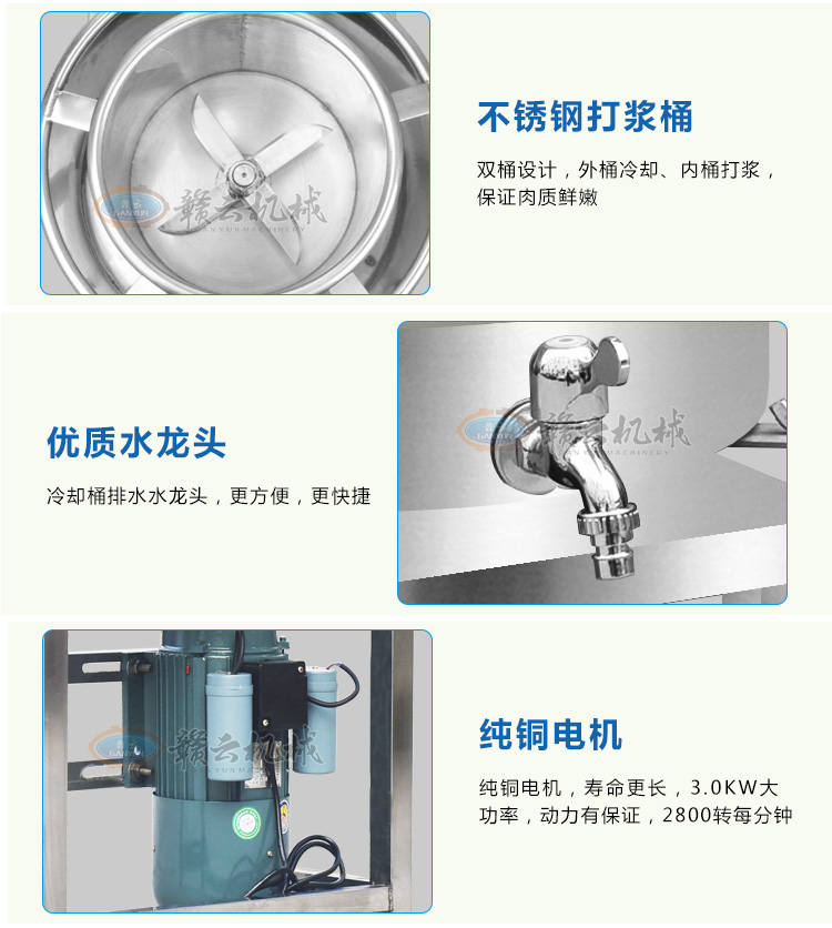 贛云牌全不銹鋼傳動高速肉丸打漿機,整機采用優質不銹鋼材質,拉伸桶底部弧形設計,贛云新款肉丸打漿機標志性設計。無縫焊接技術展現高檔品質。一次性可打肉漿5-6斤,2分鐘左右即可完成肉漿的制作。所打肉漿細膩,是肉丸專用打漿設備之一。