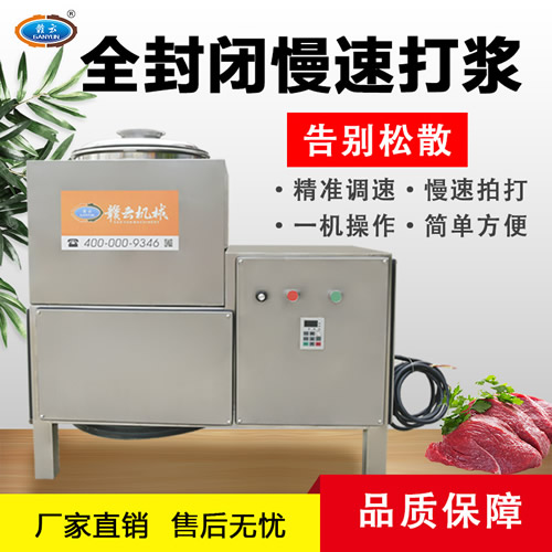 贛云牌36型全封閉式慢速變頻肉丸打漿機選優質不銹鋼,在全不銹鋼慢速肉丸打漿機基礎上將整機外殼用不銹鋼板材封裝,更好的保護電動機,通過小皮帶輪帶動大皮帶輪減速,慢速拍打肉漿。