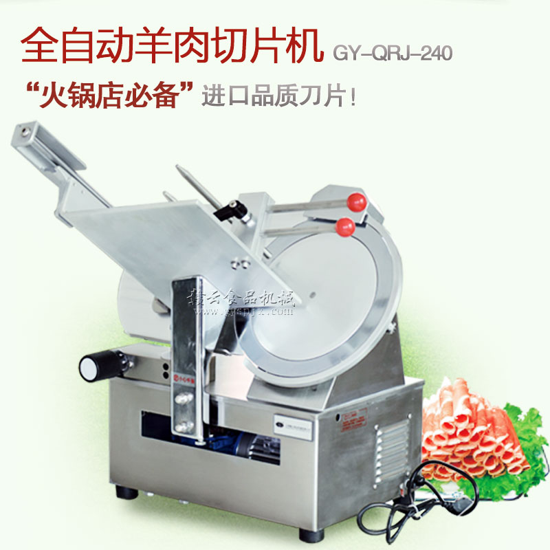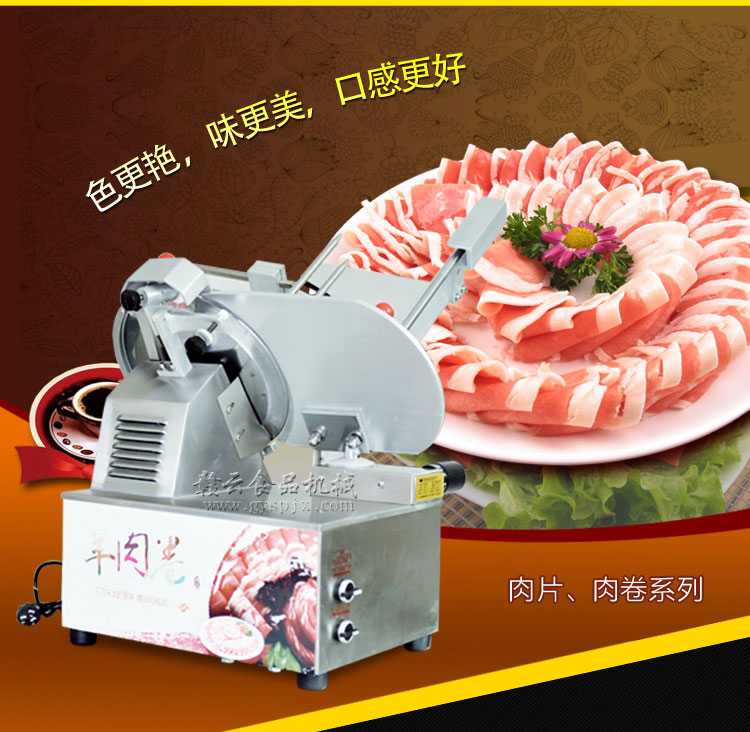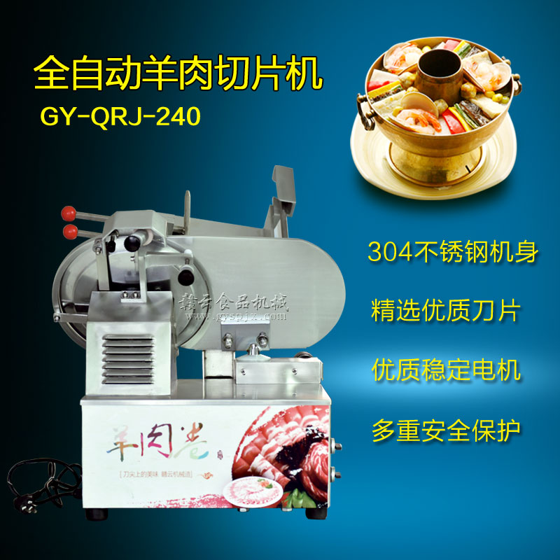 贛云牌全自動羊肉切片機采用加硬不銹鋼刀片,有效的保證了切割效率,切片厚薄可調0-15mm,可切零度以下凍肉,是凍羊肉、牛肉、豬肉切片,切卷利器;該機采用雙電機分別控制切肉刀轉動和推料走動,切肉刀轉動控制開關關閉狀態會自動切斷推料走動電機電源,已確保操作人員的人身安全。整機設計科學合理、美觀大方、省時省力、安全高效,是火鍋店、酒店、西餐等加工羊肉卷信賴的設備。
