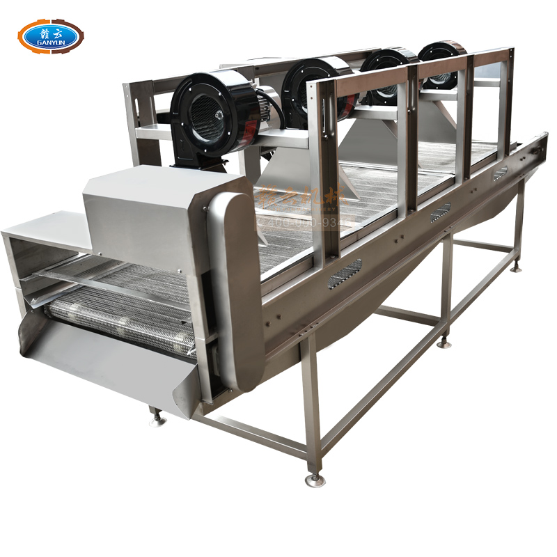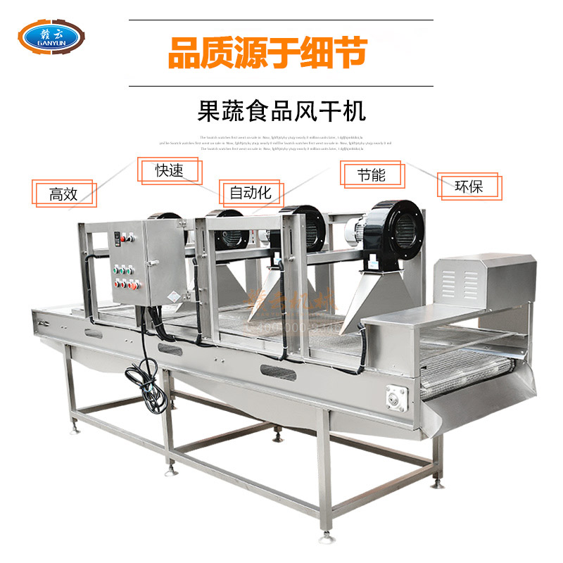 果蔬食品風干機,高效、快速、環保、安全、自動化。強風去除表面水分+震動輸送。果蔬食品風干機主要用于清洗后的果蔬去除表面水,震動吹干改變了傳統離心脫水機帶來的蔬菜也損傷和傳統風干機除水不徹底等問題,蔬果切割后清洗后進入震動風干機,在震動頻率下使物料向前傳送,在傳送過程中經過多次強風吹落物料表面的多余水分,使其蔬果表面無水鮮亮。最大程度上節約時間成本,勞動成本和運營成本,廣泛適用于蔬菜加工行業及廠礦、部隊、醫院、各大院校等單位食堂。