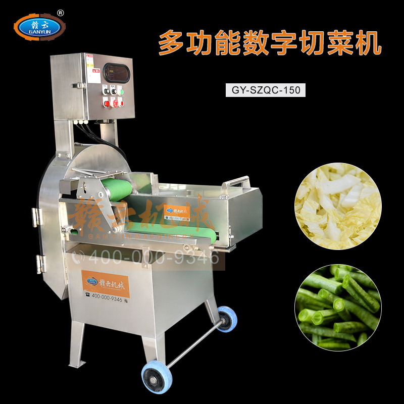 中央廚房凈菜加工設備之一_贛云牌150型數字切菜機,引進先進技術,利用斬刀快速切割原理設計,適合各類葉菜類,球根類的切割工序,1-60mm范圍內變頻可調,適合多元化中央廚房參與食堂切配之用,贛云機械,掌握肉丸加工成套設備,中央廚房凈菜設備核心技術,咨詢電話400-000-9346