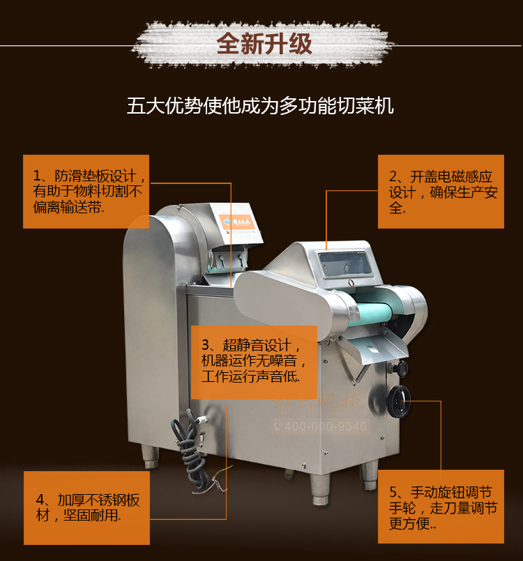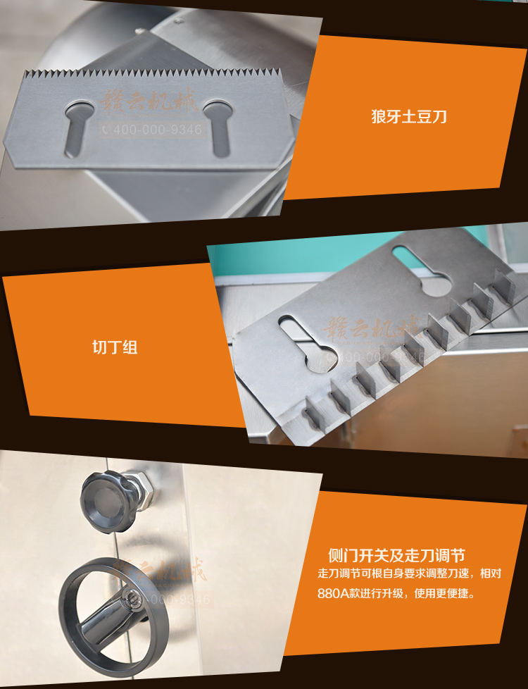 贛云880B型切菜機,采用標準不銹鋼板材加工設計,做工精細,外形美觀大方,利用齒輪偏心設計手動旋鈕便攜可調走刀量,在原880A型切菜機基礎上改良設計而成,解決多功能切菜機手動走刀量調節問題,是食堂,企業單位、酒店廚房多樣切菜設備。