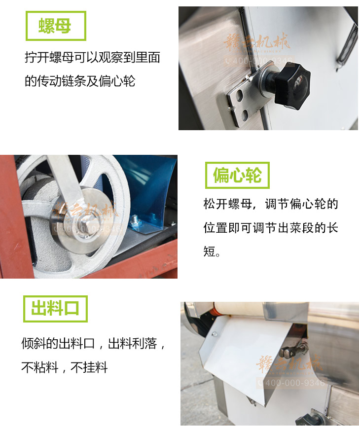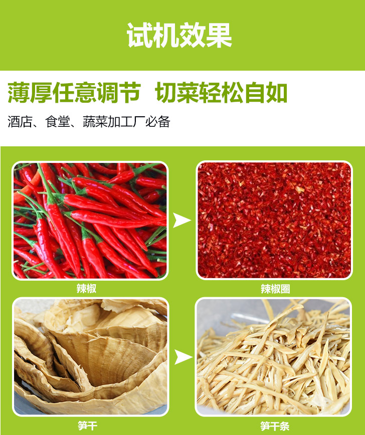 4、蘆薈粒、蘆薈條。改變切刀與送料槽安裝角度為專斜切機將根莖類蔬菜:如馬鈴薯、蕃薯、黃瓜、竹筍、洋蔥、茄子等切片、條、丁,適合衛(wèi)生餐飲人員或食品加工廠使用. 用途:葉菜類:可切芹菜、大白菜、高麗菜、菠菜、蔥、大蒜、瓜類等長條狀之物切成片、絲、段狀,適合食品加工業(yè)者配合自動化生產線。