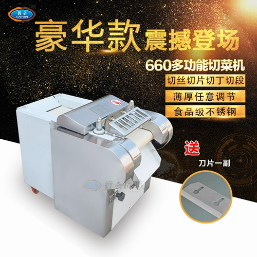 贛云牌多功能切菜機是根據(jù)多種樣機在實地使用中存在不足之處,反復改進設計制造,采用不銹鋼和全滾動軸承結構,具有外形美觀,成熟可靠,使用維修方便等特點。適用直蔬菜脫水、速凍、保鮮、腌漬等食品行業(yè)各類蔬菜。刀片距離可調節(jié)在0.1cm-2cm之間即切片、丁、絲厚薄在0.1cm-2cm。