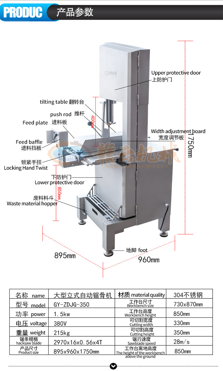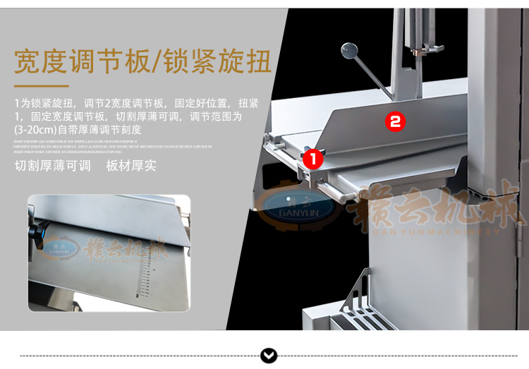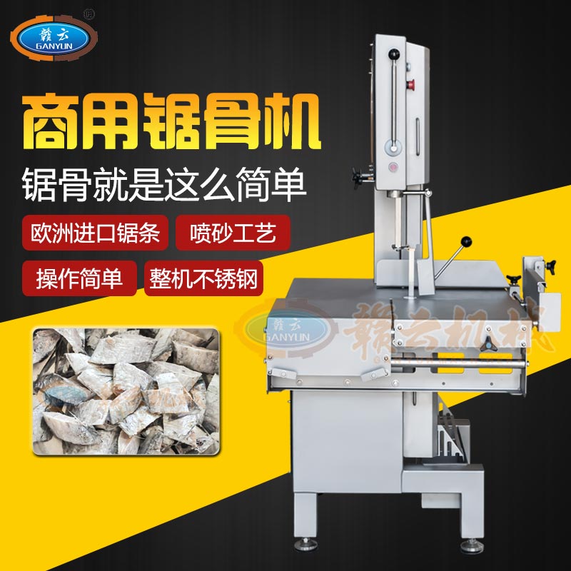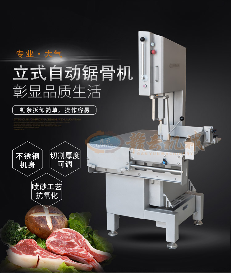 鋸骨機,鋸骨頭用什么,骨頭克星 大型立式商用鋸骨機,304不銹鋼制作,所用板材均為加厚不銹鋼,整機噴砂工藝,做工精湛。兩種推料切割方式,小塊切割和整板分割方式,可根據實際操作切換,使用過程中靈活度高,應用范圍廣。采用優(yōu)質鋸條,鋸齒鋒利,耐磨韌性好,使用壽命長,輕松分解凍肉凍骨等高硬度食材,整機設計合理,鋸條與機身的拆卸簡單易懂,清洗方便徹底,在中央廚房,單位食堂、餐飲配送中心及肉聯(lián)廠等地應用廣泛。