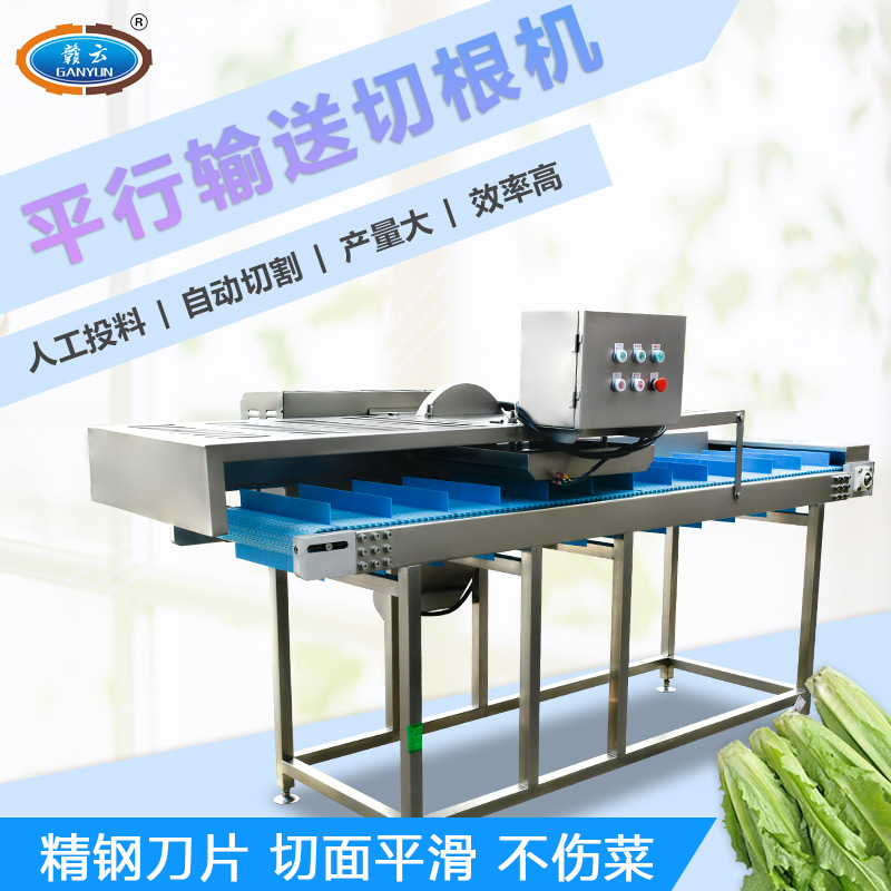 平行輸送去根機由輸送板帶動物料前行,蔬菜經過固定位置的刀盤后,蔬菜根部被切割從廢料口出來,保留的蔬菜則向前輸送。切割的長度可以調節,每顆蔬菜所切割出來的廢料都相等。去根機適合大型食品加工廠、凈菜生產線等。