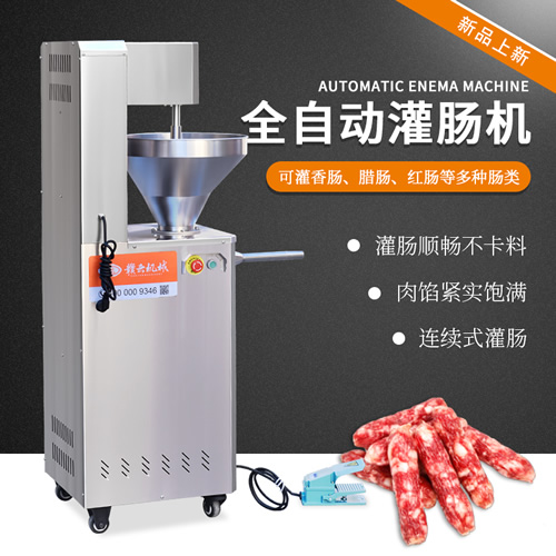 贛云牌立式全自動灌腸機,根據多次的機器實地使用和存在不足之處反復改造后的全新配置升級,采用不銹鋼機身,機頭使用可拆卸,方便機器清洗,速度平衡穩定,不銹鋼機身,腳踏控制灌腸,大功率電機,無論是四川香腸、湖南臘腸、脆皮腸、山東香腸、廣式臘腸還是河南臘腸都適用,一機多用,設備滿足多重風味香腸制作,新升級的機器加寬加大入料口,讓您進料順暢不卡料,灌腸機可以與多臺設備聯合使用,可與切片切絲機,拌餡機,灌腸機,香腸打結機組成,提高您的生產效率。