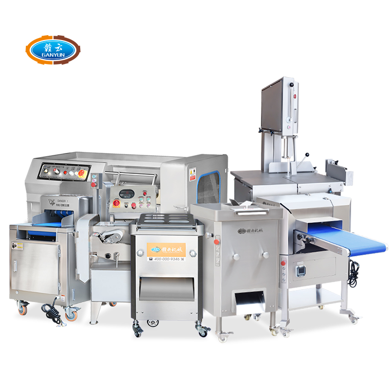 無刀化肉類加工設備,一套符合無刀化加工標準的肉類切割設備:大型自動鋸骨機、智能切塊機、120A智能砍排機、360型切肉絲機、300型切肉片機、350型平行開條機等等。