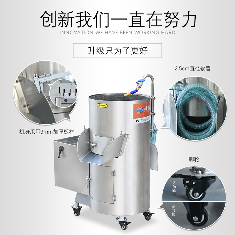 初次使用土豆脫皮機前,請先檢測機器的各個部件是否齊全和安裝穩固,并且電源是否正確接通,可參閱土豆脫皮機使用說明書,在檢測無誤后,先將土豆放入脫皮機的料桶后,將電源開關打開,電源開啟后,料桶地盤通過高速旋轉將不斷翻動土豆并且讓土豆與周邊磨砂摩擦達到去皮效果,高速帶動土豆在料桶壁上不停的碰撞摩擦,使土豆去皮效率高。土豆脫皮機料桶底盤采用沙盤構成,凸起部位設計,有效翻動食材,和桶壁磨砂高度配合,360度全面脫皮不殘留。在通過可調節膠頭滴管,根據操作需要隨心調節水流,想沖哪里沖哪里,省時省水去皮之后更干凈配上開關閥門,停放水更方便,可以保證出工后的土豆干凈、清潔。