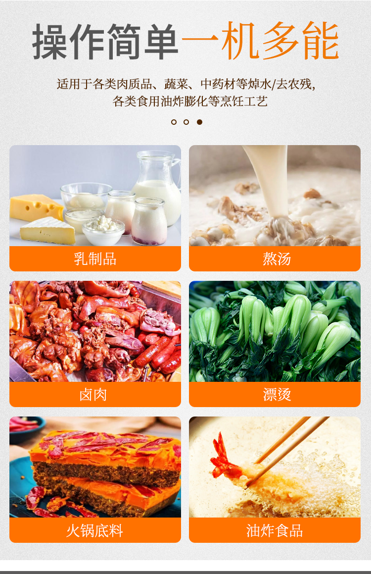 適用于肉制品、蔬菜、中藥材等漂燙焯水、殺菌、去農殘或油炸食品的膨化等工藝