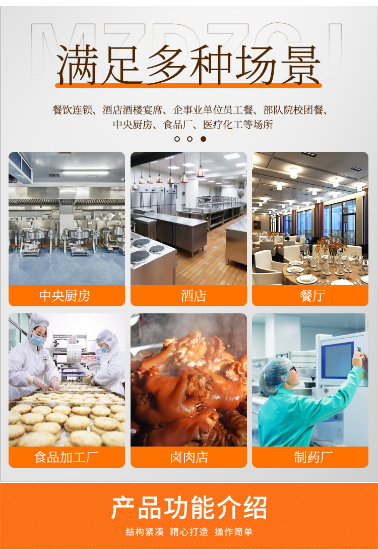 機器滿足多種場景,廣泛應用于餐飲連鎖、酒店酒樓宴請、企事業單位員工餐、院校團餐、鹵食店、中央廚房、預制菜食品廠等場所。