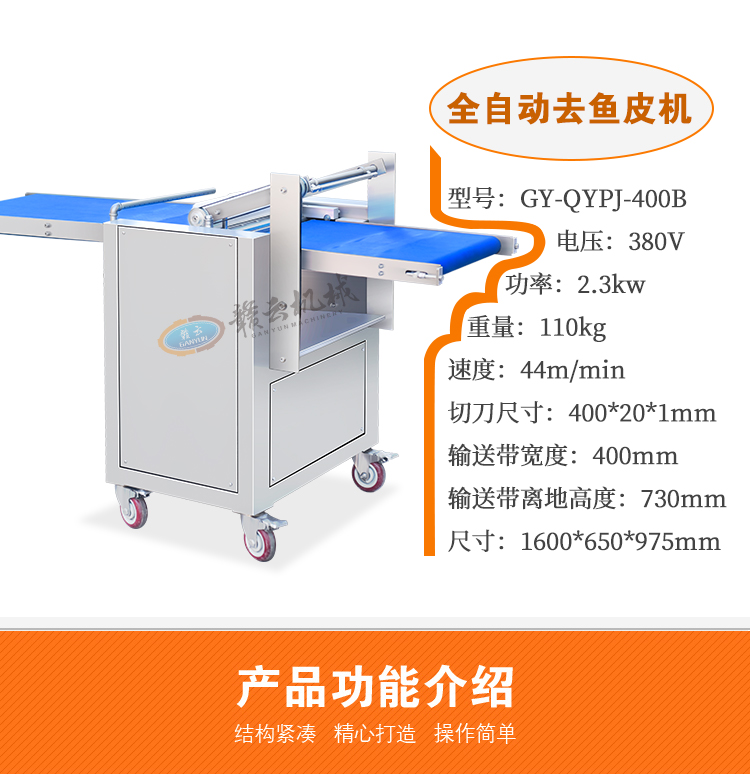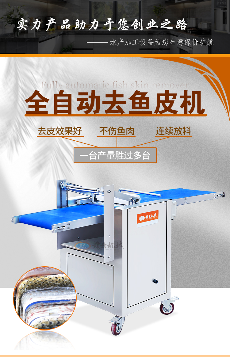 贛云全自動去魚皮機采用輸送式進行魚肉去皮,通過連續流水式的去除魚皮,可以達到快速、高效率的進行去魚皮加工,魚皮去除干凈,不損傷魚肉,適用于多種魚類的去皮加工。設備使用食品級不銹鋼材質打造,操作簡單,是一款受歡迎的魚肉前處理加工設備。