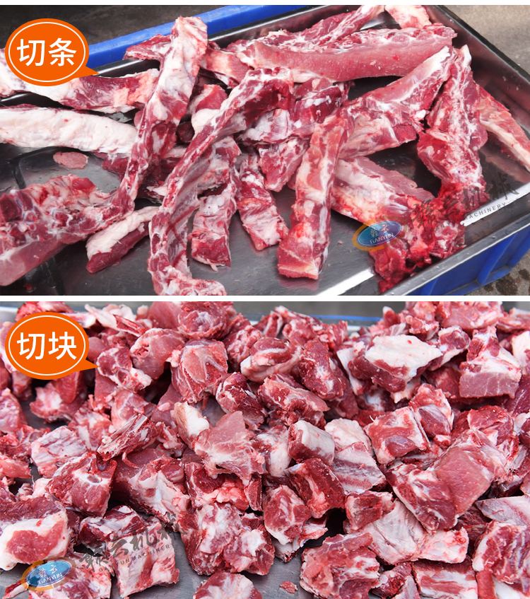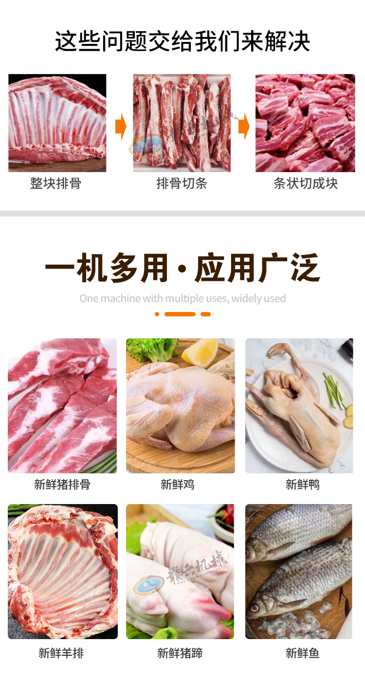 用于新鮮豬排骨、羊排、雞、鴨、魚、兔子、豬蹄的切條切塊加工。